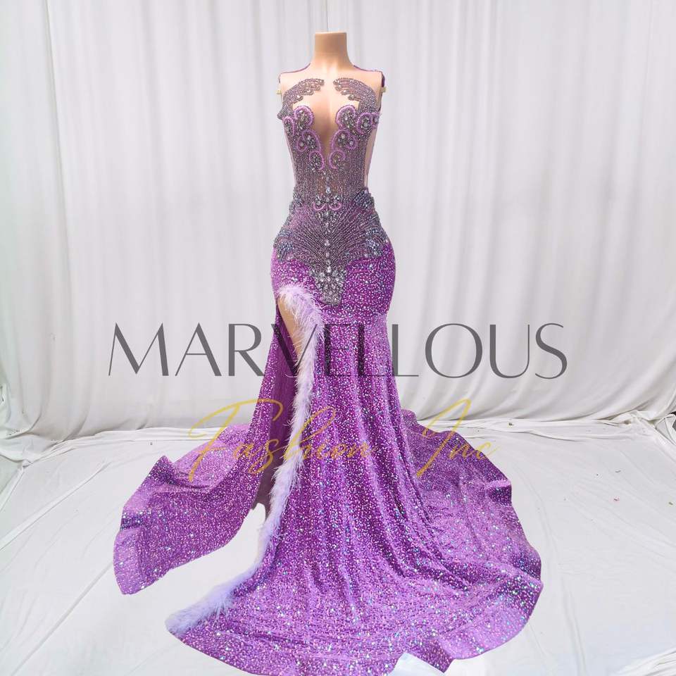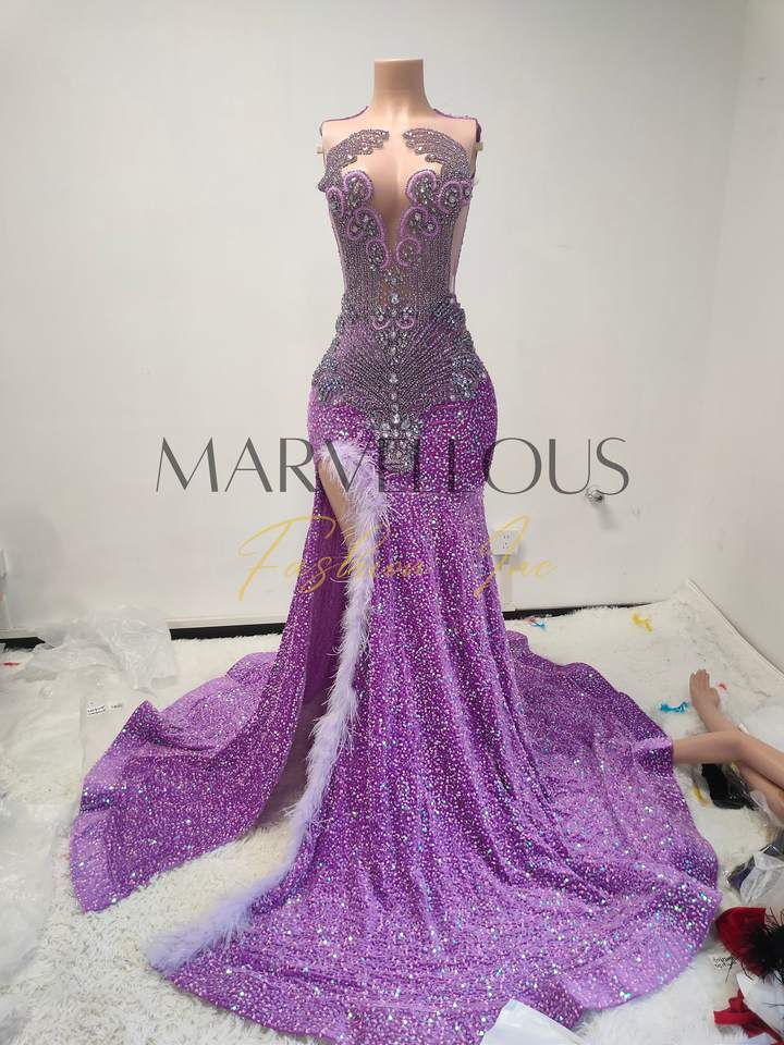 MF Designer Custom Purple Feather Rhinestone Vestidos Fiesta de noche Romántico Mujer Lentejuelas Vestido largo de fiesta Sexy
