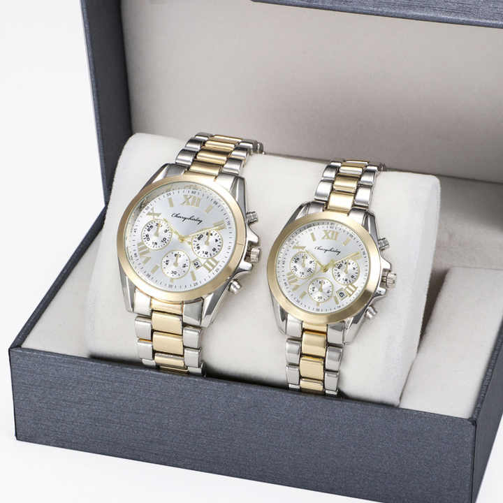 Reloj de Pareja Estilo MK Bicolor en Tono Dorado con Movimiento de Cuarzo y Tapa Trasera de Acero Inoxidable para Hombre y Mujer