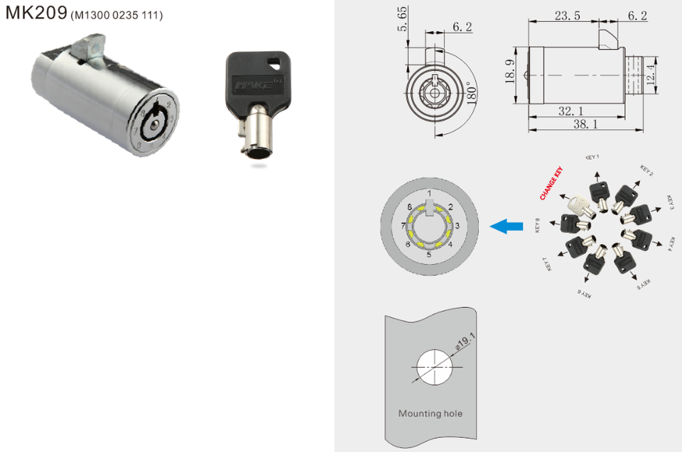Cerradura de Cilindro Redonda MK209 con Código Cambiable, Cerradura de Leva Metálica para Gabinetes, Cerradura Tubular para Máquinas Expendedoras con Sistema de Llave Maestra