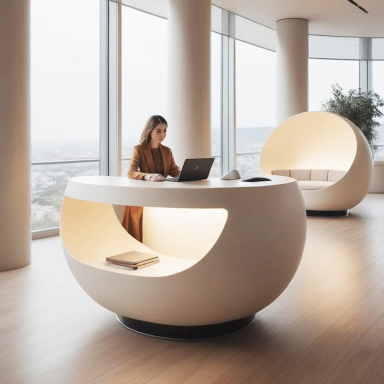 Mostrador de Recepción Redondo de Fibra de Vidrio Duradero ML-D019, Diseño Moderno, Color Personalizado, para Escuelas, Hoteles, Hospitales, Centros Comerciales