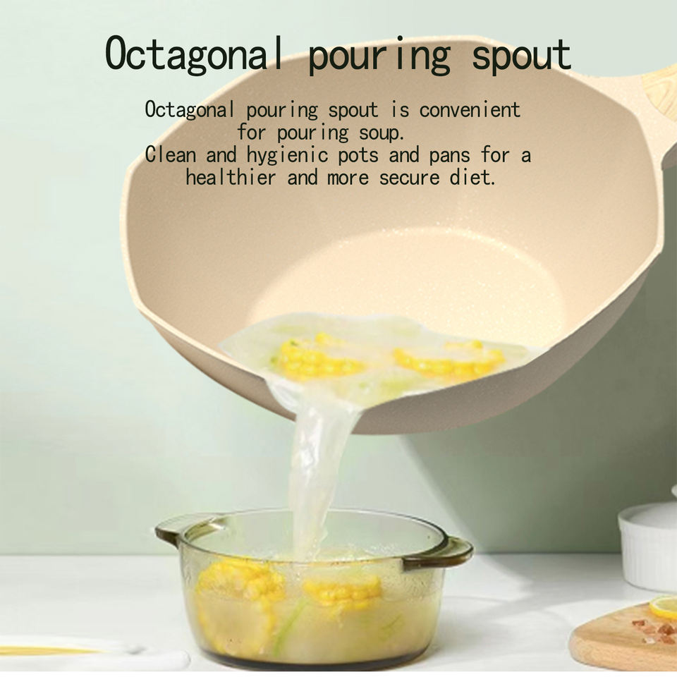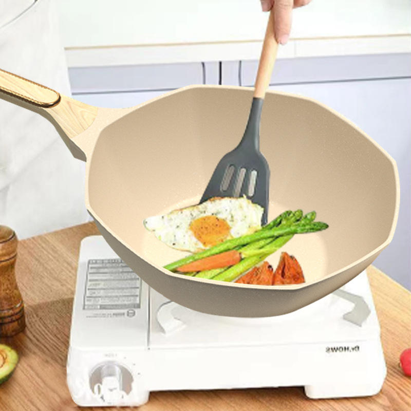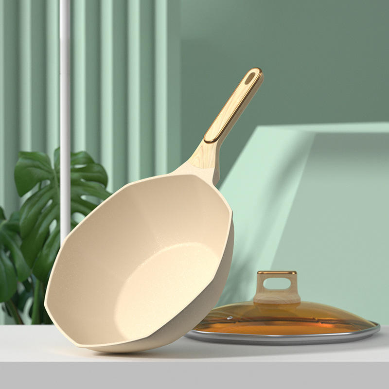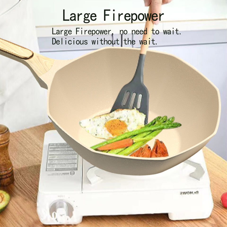 Juego de sartenes y woks compatibles con cocinas de inducción MLD de aluminio, con interior antiadherente, base multicapa, tapa de vidrio y mango de madera