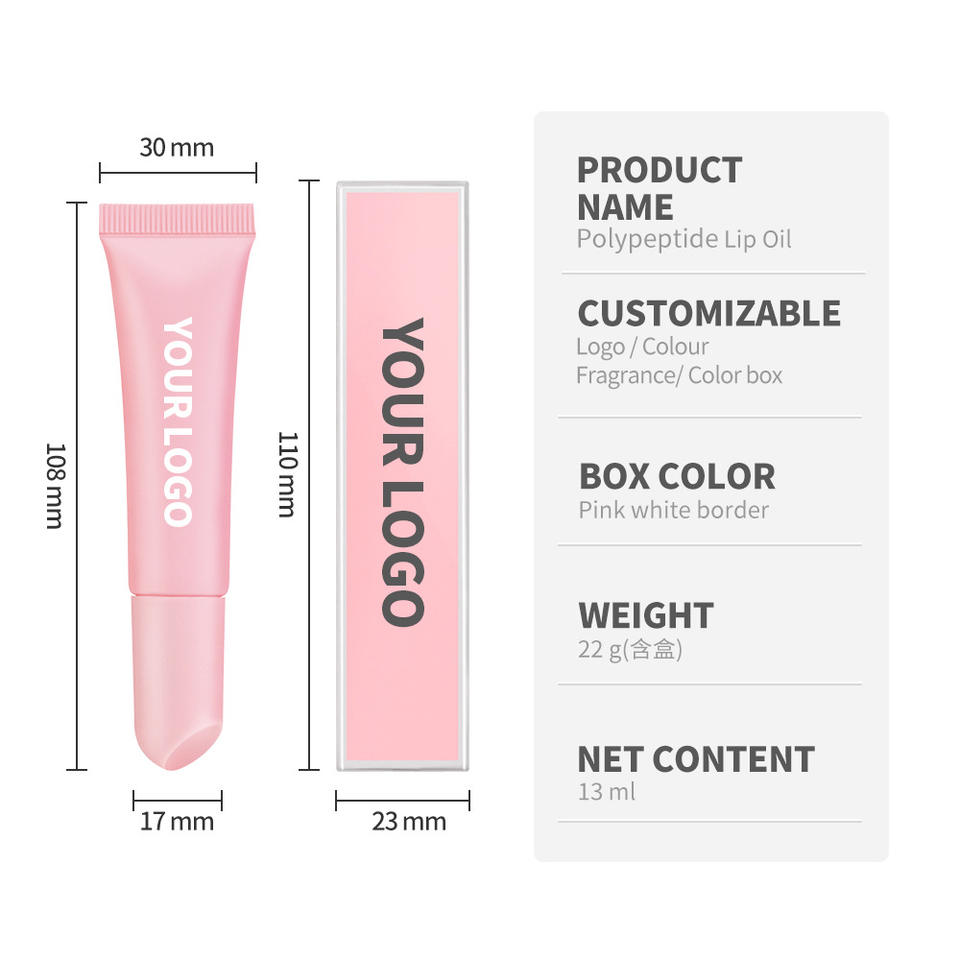Brillo labial personalizable MLM de alto brillo con péptidos, aceite labial hidratante con aroma a frutas, brillo labial en tubo suave rosa.