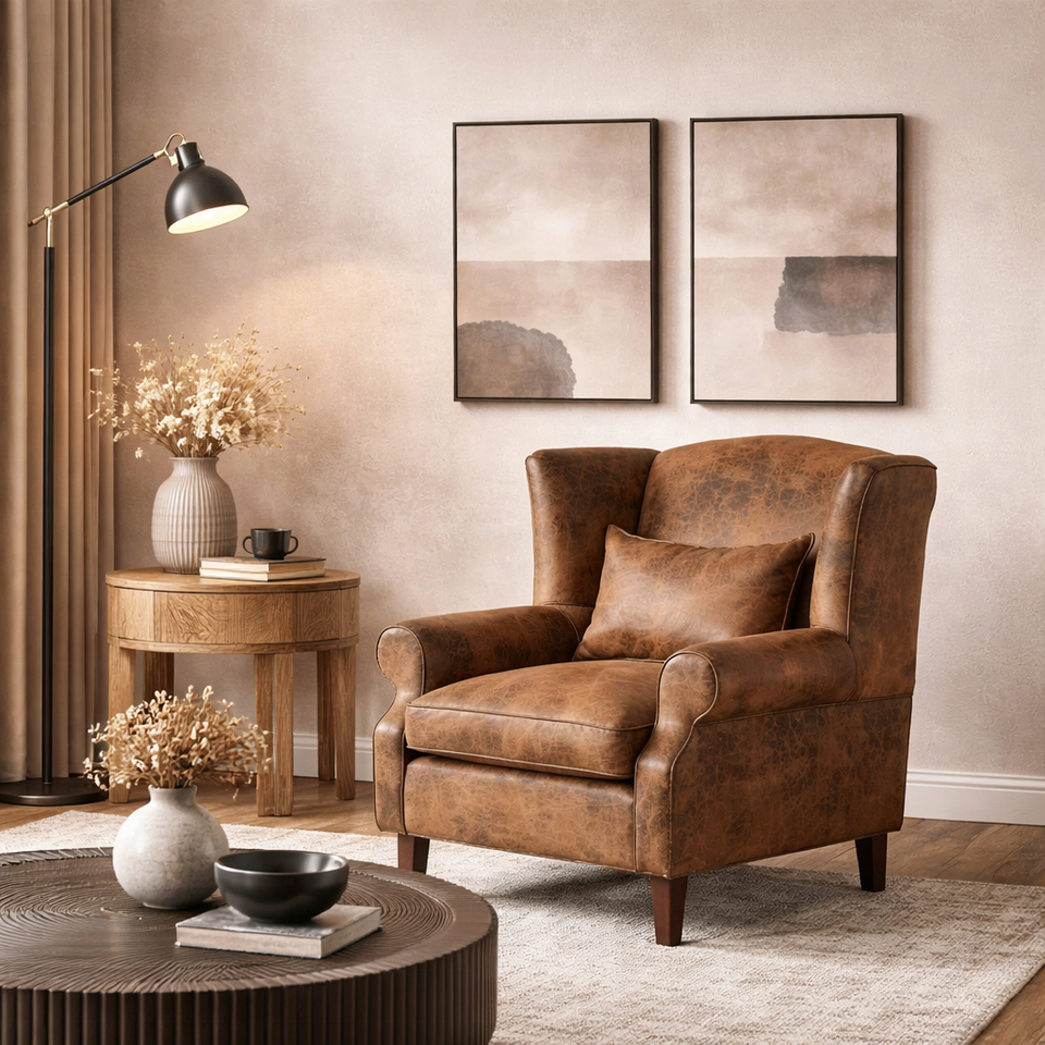 Sillón Moderno de Mediados de Siglo con Reposabrazos de Cuero Genuino | Marco de Madera Maciza Relleno de Espuma | Sillón Club Vintage para Sala de Estar de Villa