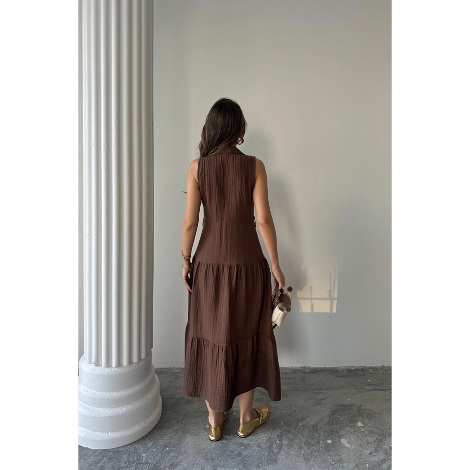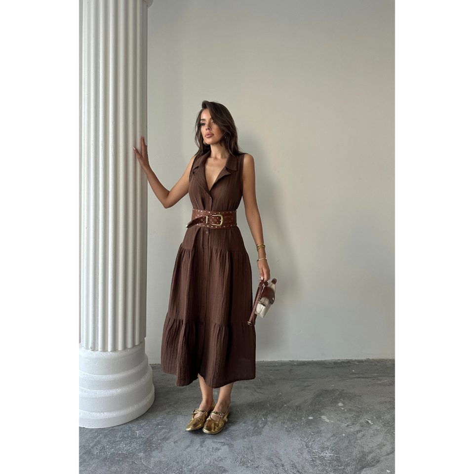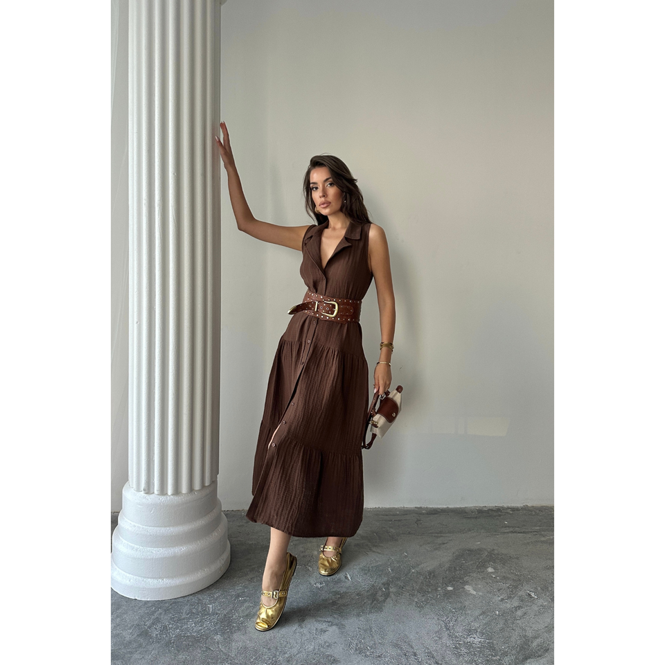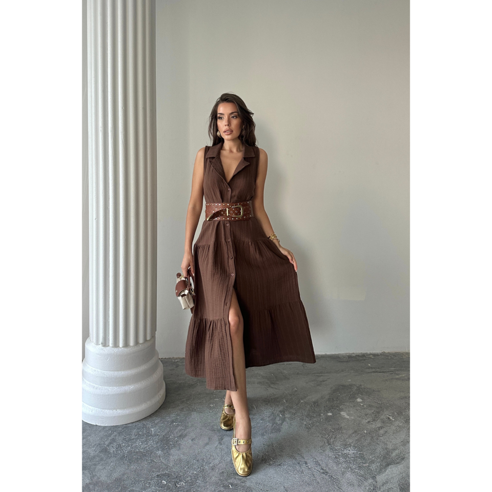 VESTIDO DE MUSLINA SIN MANGAS CON BOTONES EN LA PARTE DELANTERA, COLOR MARRÓN MEDIO, VESTIDO DE TRABAJO