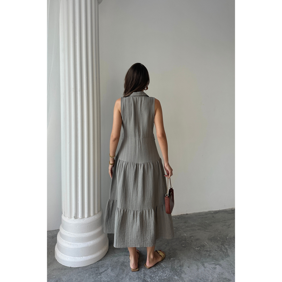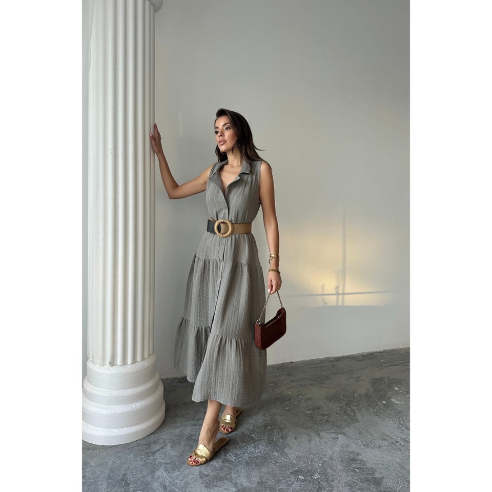 VESTIDO DE MUSLINA SIN MANGAS CON CUELLO GRIS MEDIO, ESTILO CASUAL