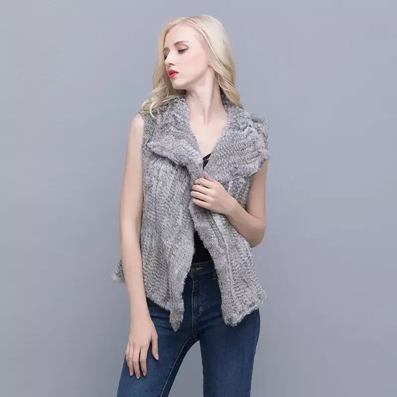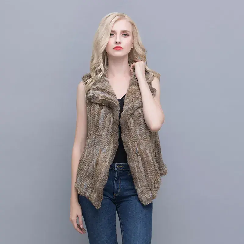 MWFur moda conejo piel tejido Chaleco con cuello invierno moda sin mangas sólido pelo de conejo Chaleco corto para mujer