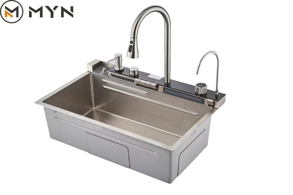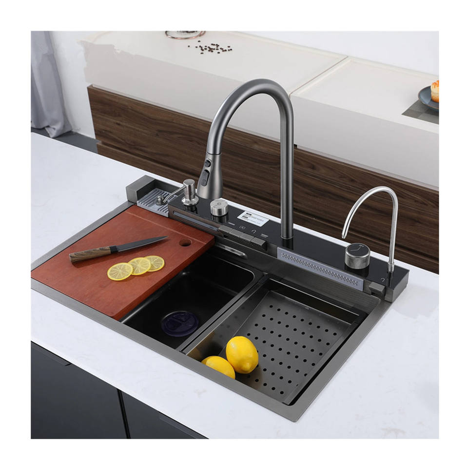 Fregadero de cocina inteligente MYN con grifo de cascada, fregadero de cocina negro de panal biónico con ranura única grande de acero inoxidable
