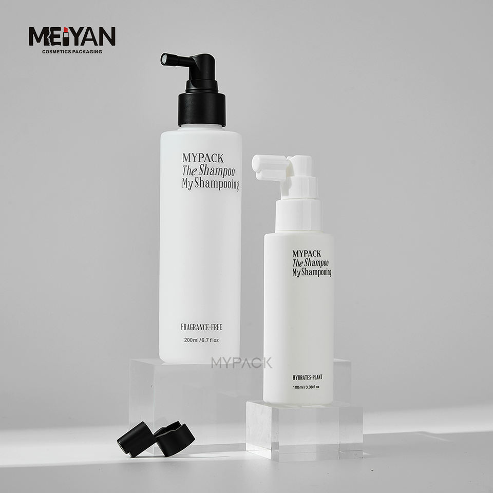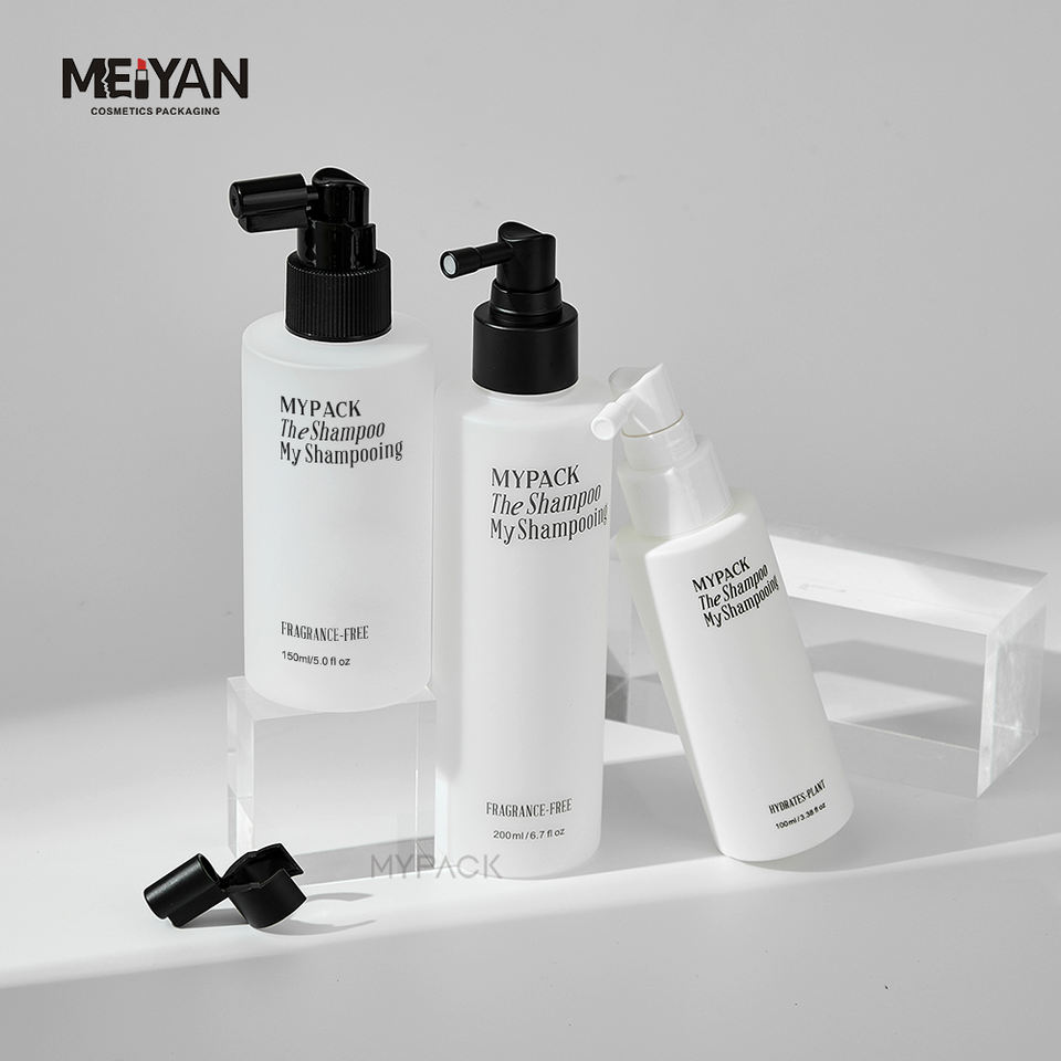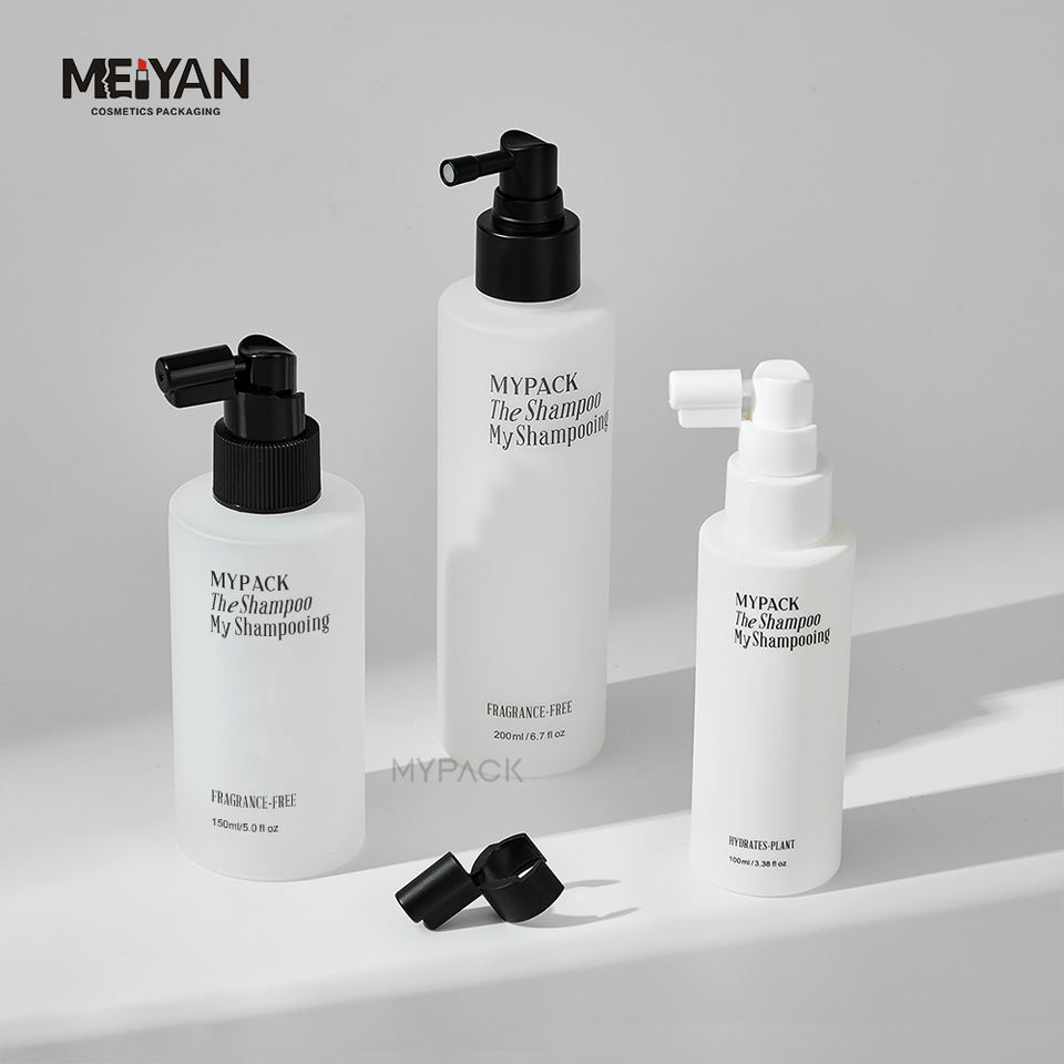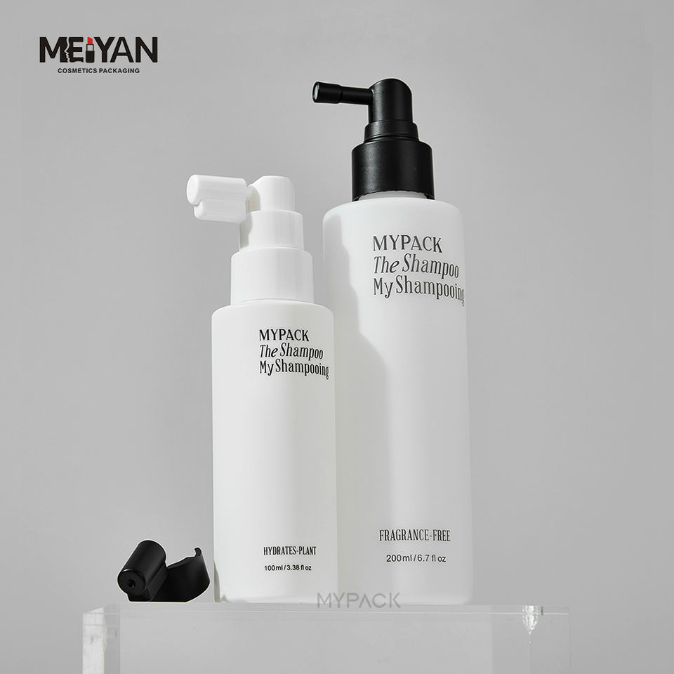 MYPACK personalizado redondo 100ml 150ml 200ml HDPE tacto suave blanco vacío salón tónico para el cabello raíz boquilla larga botella de spray de niebla fina
