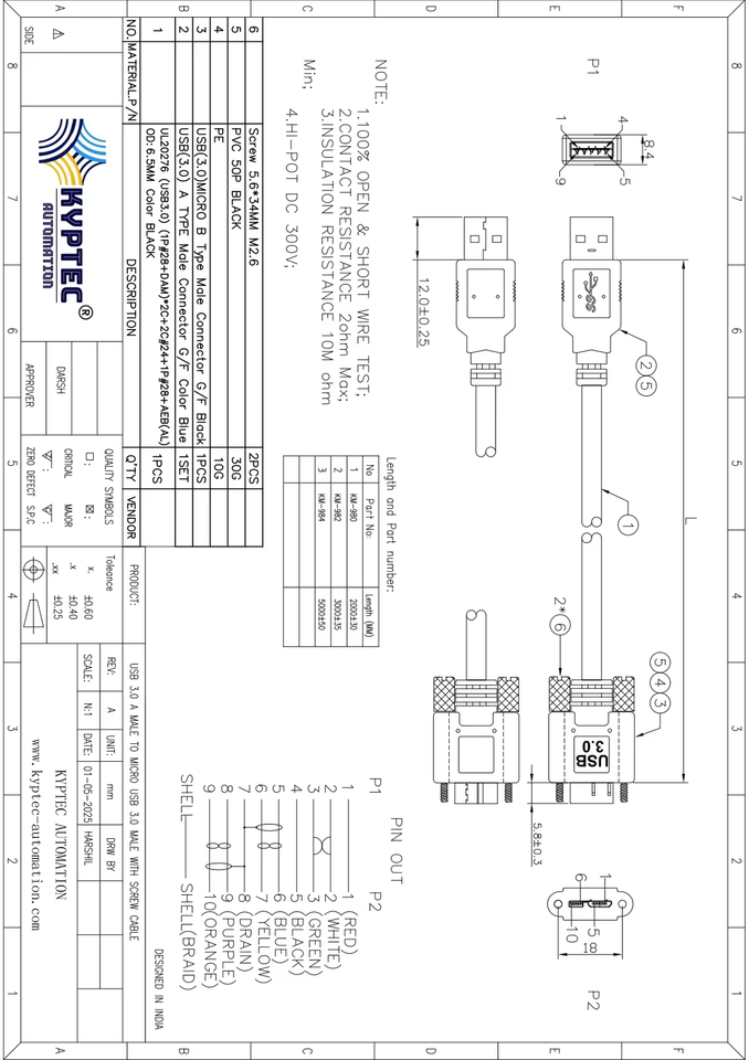 Cable USB 3.0 para Visión Artificial, Macho Tipo A a Macho Micro USB 3.0 con Conector de Bloqueo por Tornillo para Cámara Industrial