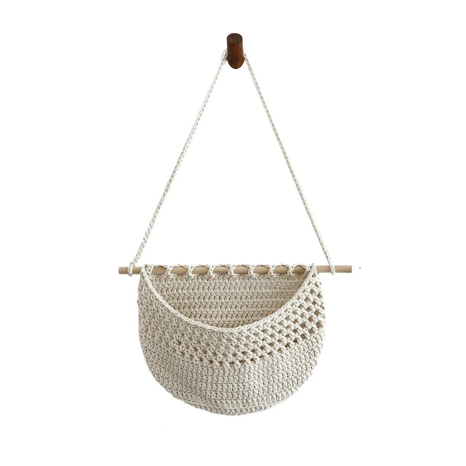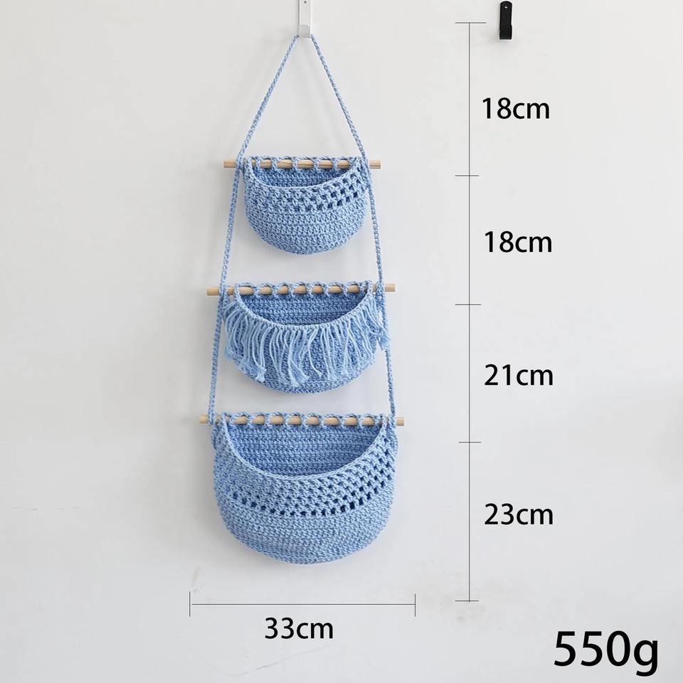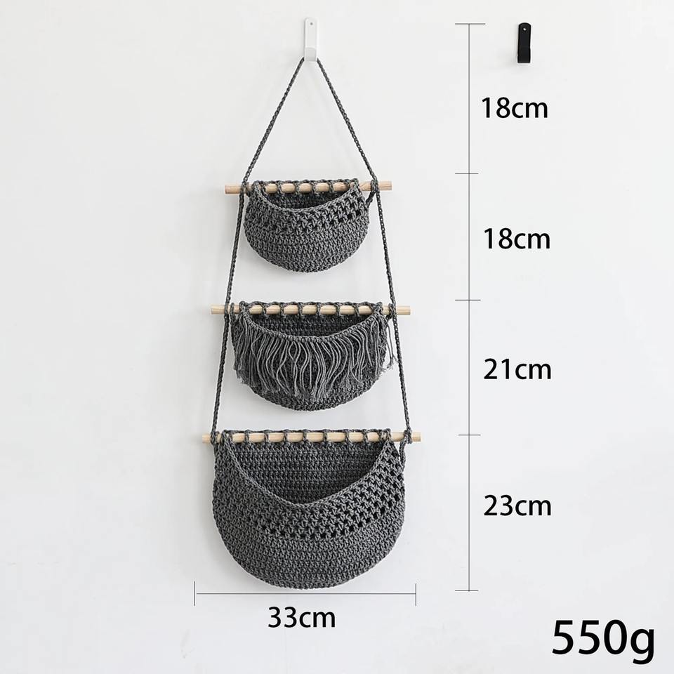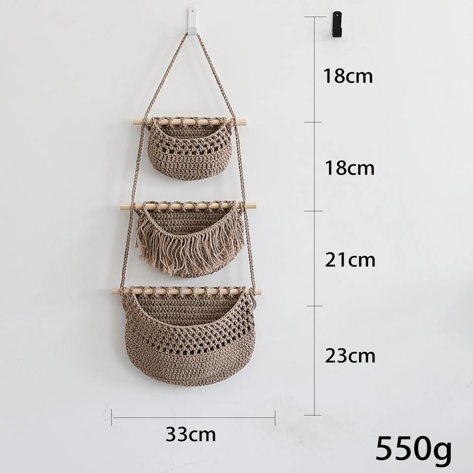 Juego de 3 cestas colgantes de macramé con barra de madera, ideal para organizar la pared del hogar, la sala de estar, el dormitorio y la decoración boho.