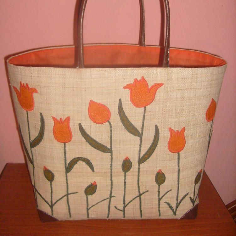 Bolso de Rafia de Madagascar con Decoración de Bordado Colorido, Asas de Cuero, Esquinas con Cordón, Cierre de Tela, Carteras Coloridas