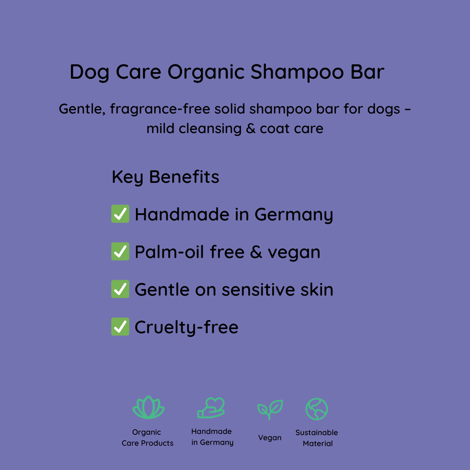 Barra de champú orgánico para el cuidado de perros 75g | Limpieza suave orgánica con aceite de coco y vitamina E | Sin fragancia | Hecho a mano en Alemania