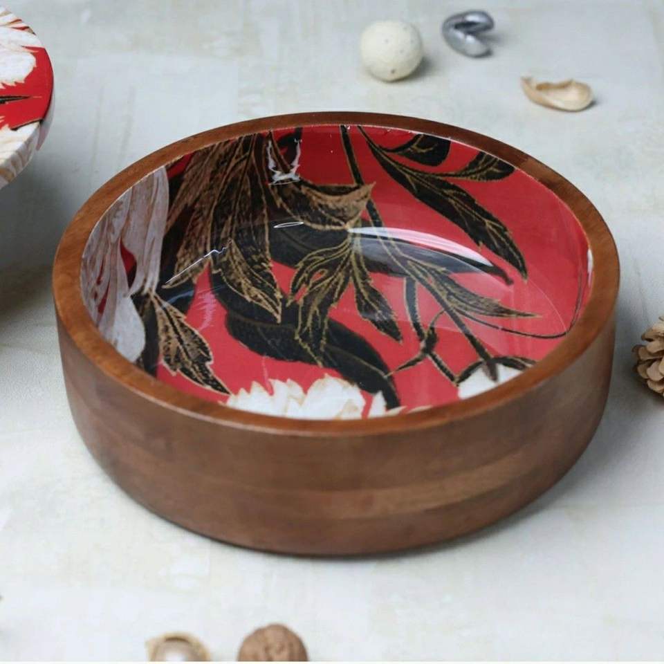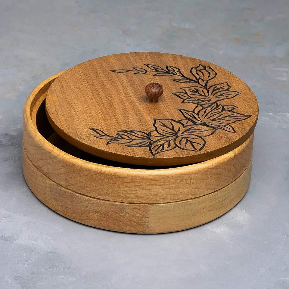 Caja de Roti de Madera Hecha en India con Tapa de Esmalte y Pinzas, Hecha de Alta Calidad, Forma Redonda, la Mejor Calidad de la India