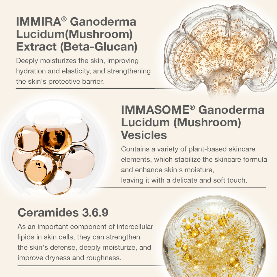 Aqua, Triglicérido Caprílico/Cáprico, Dimeticona, Glicerina, Extracto de Ganoderma Lucidum (Hongo)