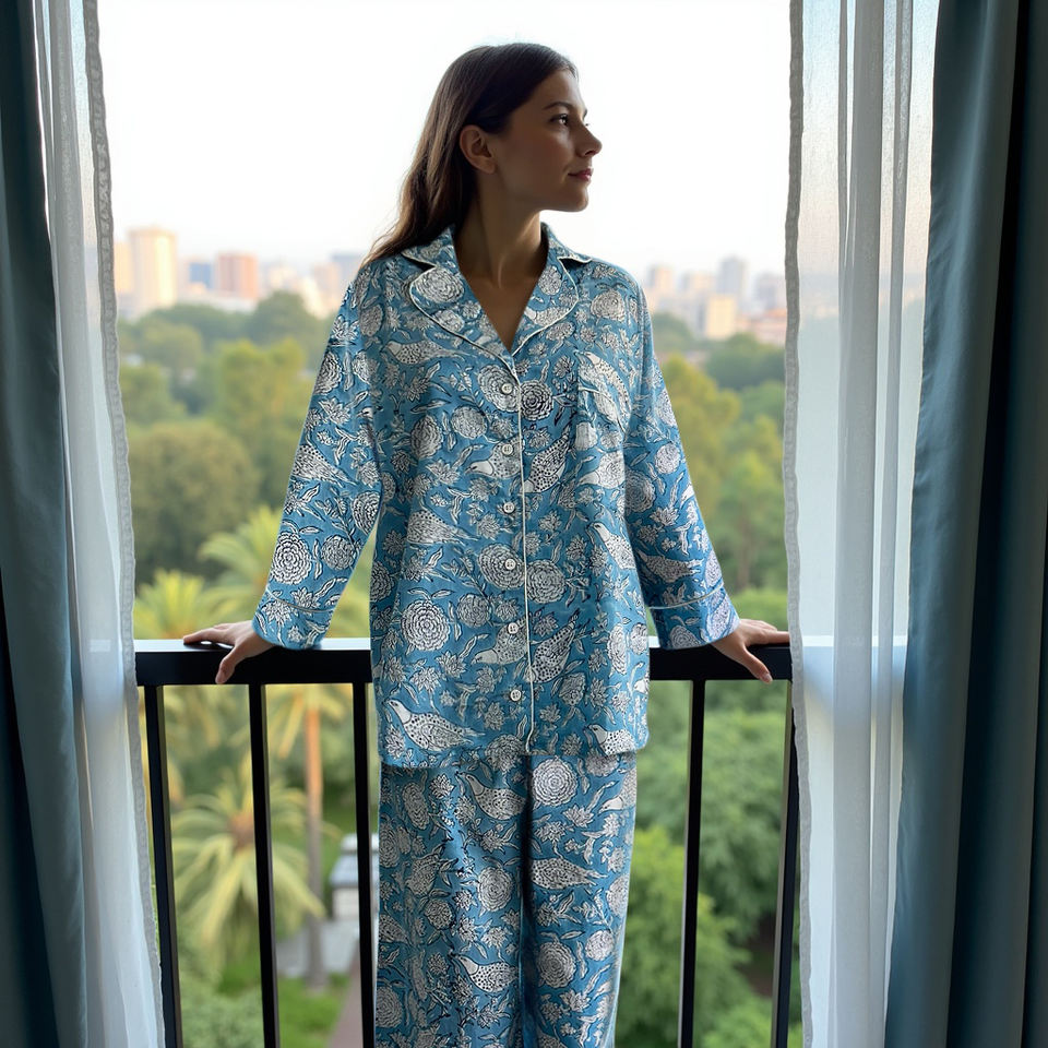 Hecho por mujeres Artesanos Crepúsculo Corona Armonía Hecho a mano Blue Bird PJ Set Fusión Moderna Facilidad con Vintage Charm Camisa y pantalón
