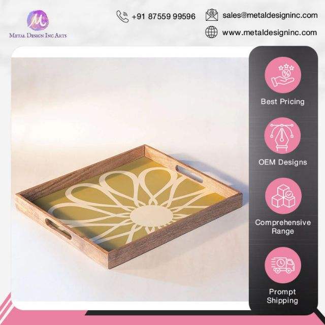 Bandejas para servir rectangulares de madera con mango pintado a mano hechas en la India Bandejas elegantes al por mayor para uso doméstico y en restaurantes