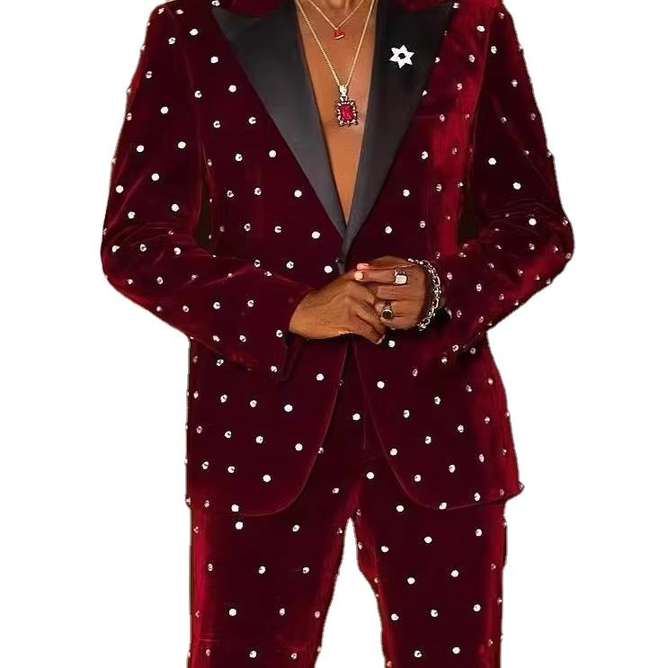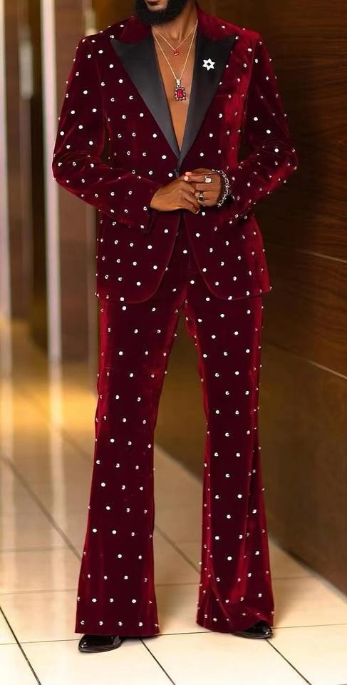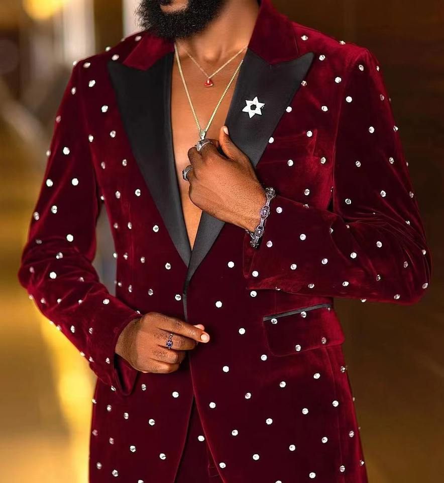 Traje de Novio Rojo a Medida (Chaqueta + Chaleco + Pantalones) con Cristales, Adorno de Joyería, Esmoquin de 3 Piezas para Hombre