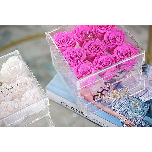 Caja de Regalo Madison Nine Rose, Flor Eterna Fresca y Preservada en Caja Cuadrada de Acrílico Rosa Intenso para el Día de San Valentín y el Día de la Madre