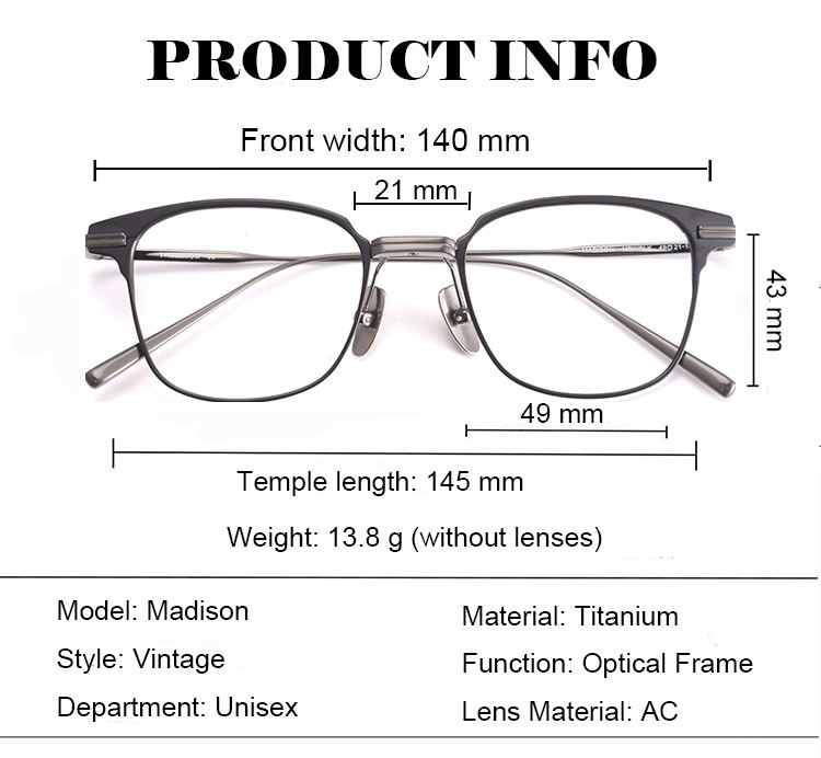 Gafas graduadas ópticas cuadradas de titanio ultraligeras Madison para hombres y mujeres, cómodas monturas de estilo Vintage