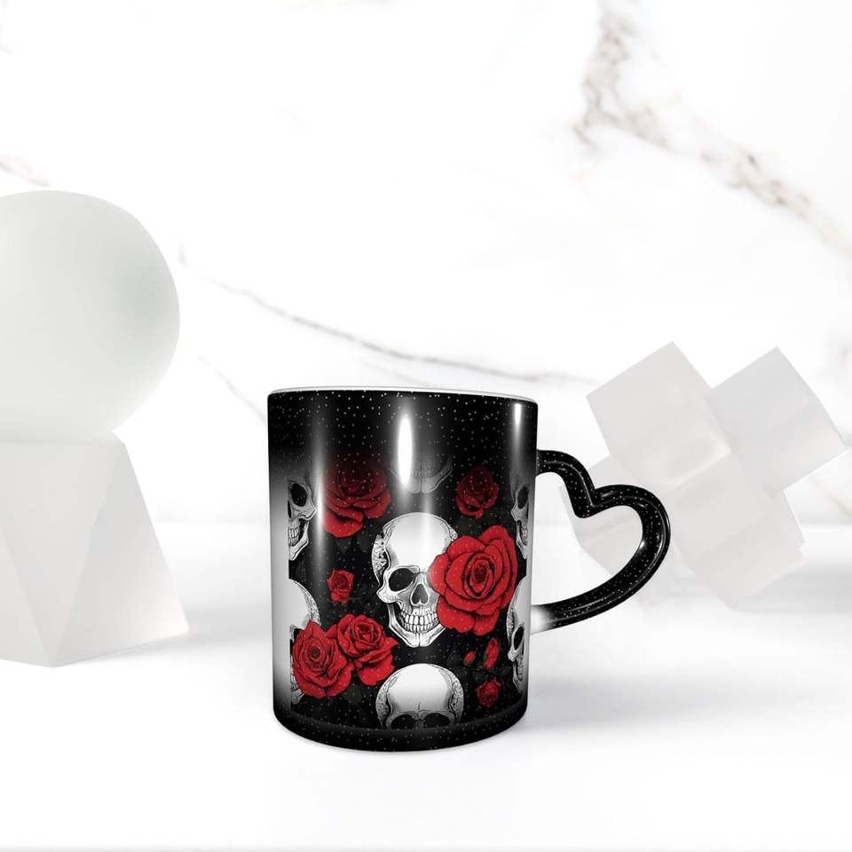 Taza mágica que cambia de color con mango de corazón, taza de café de cerámica sensible al calor de 11oz, regalo único para mujeres y hombres (calavera de Halloween)