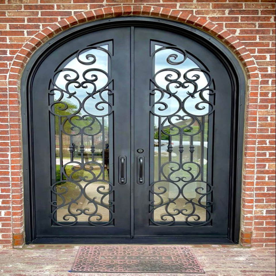 Diseño de puerta principal con marco de hierro forjado hecho a mano y rollos artísticos que ofrecen un equilibrio de belleza y protección