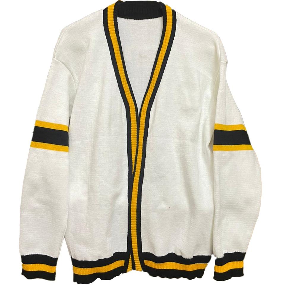 Crea tus propios diseños de logotipos personalizados en suéteres tipo cárdigan unisex de acrílico con letras bordadas y tejidos para hermandades y fraternidades.