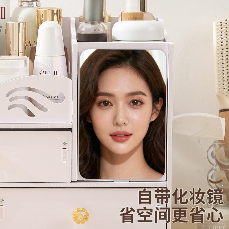 Organizador de almacenamiento con cajón y espejo para maquillaje, con frente espejado y múltiples compartimentos para almacenamiento de cosméticos en el escritorio