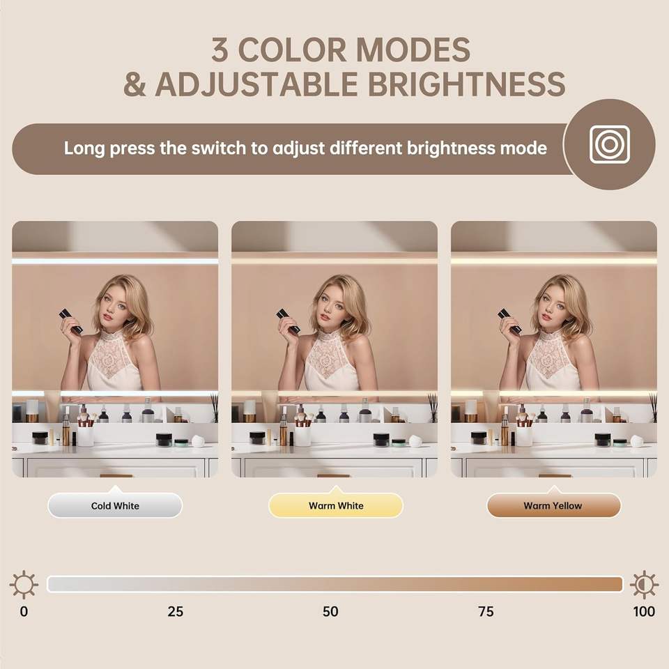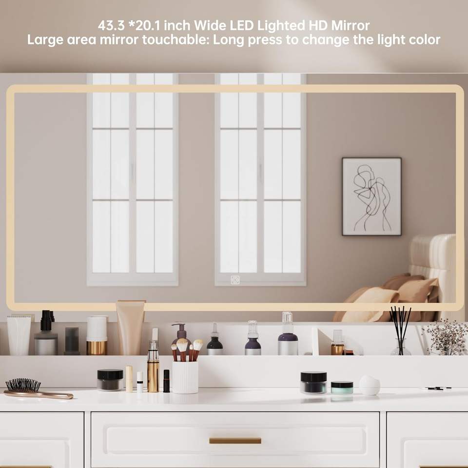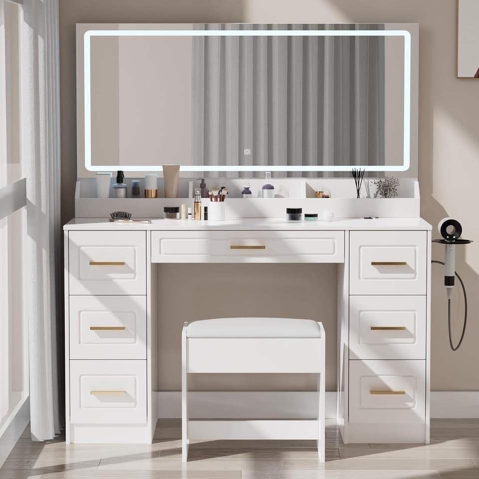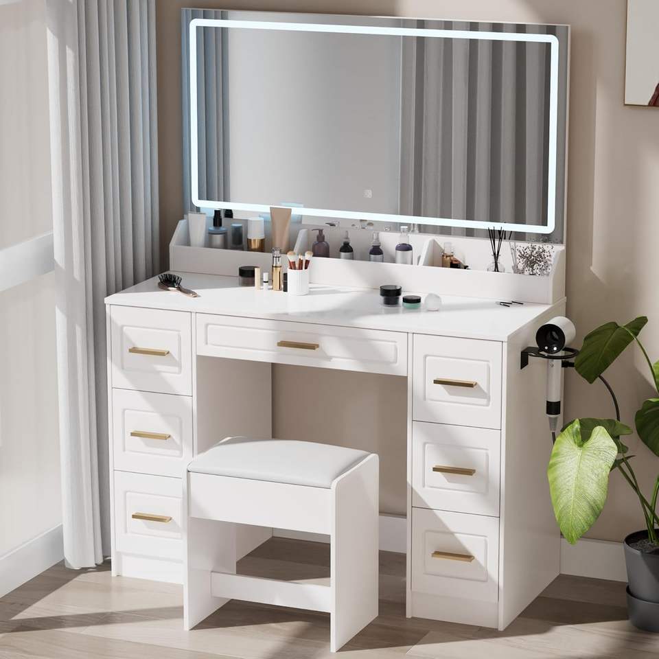 Tocador de Maquillaje con Espejo LED, 3 Opciones de Iluminación de Color, Enchufe de Carga Integrado, 7 Cajones de Gran Capacidad