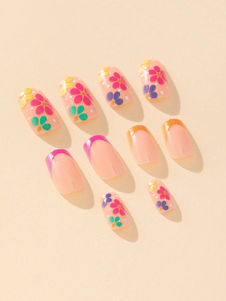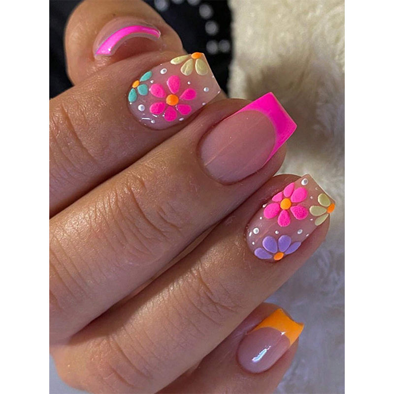 Caja de 24 Uñas Postizas Acrílicas de Estilo Francés, Cobertura Completa, Diseño de Flores Coloridas de Longitud Corta, Venta al por Mayor para Salón
