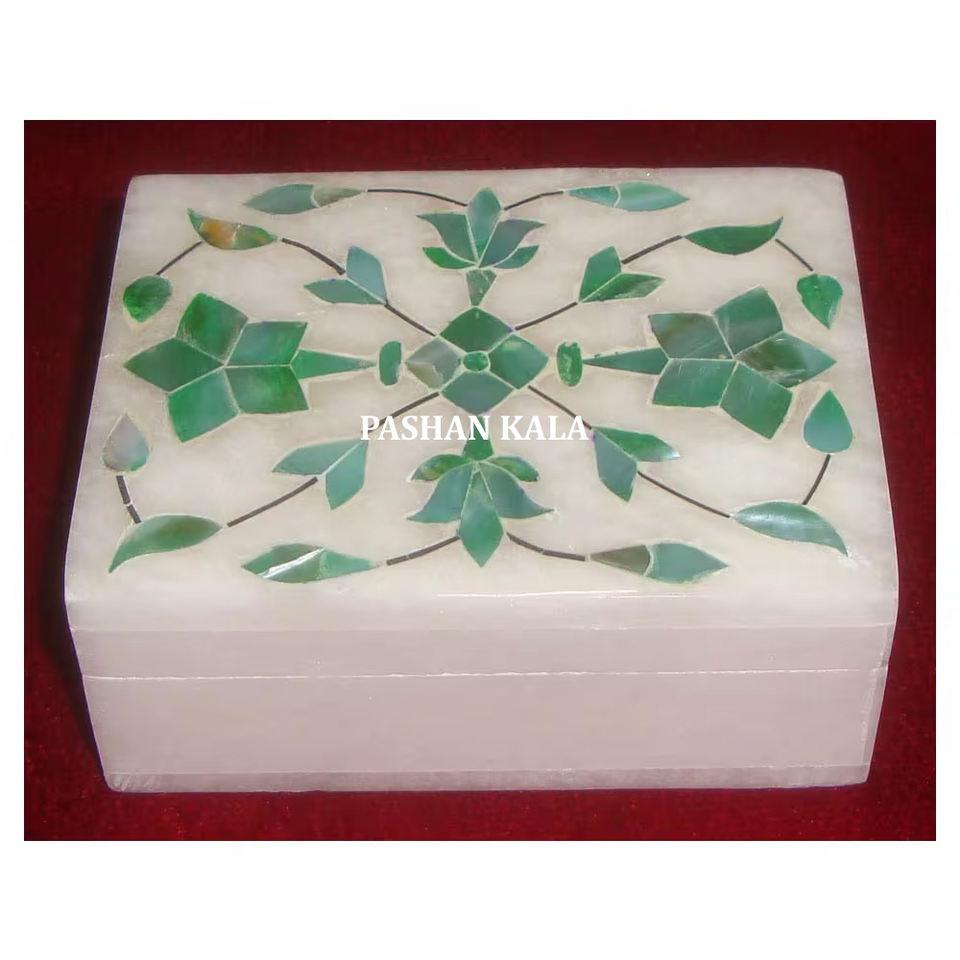 Fabricación y venta al por mayor, todo tipo de diseño, mármol blanco, forma Rectangular, incrustaciones de nácar verde, caja de almacenamiento de joyas