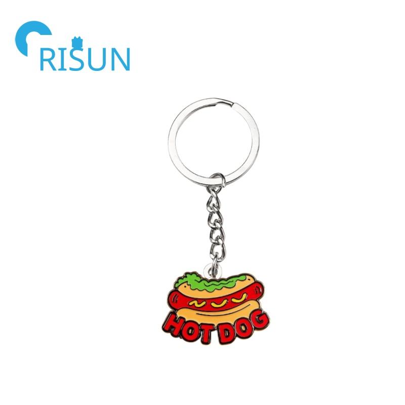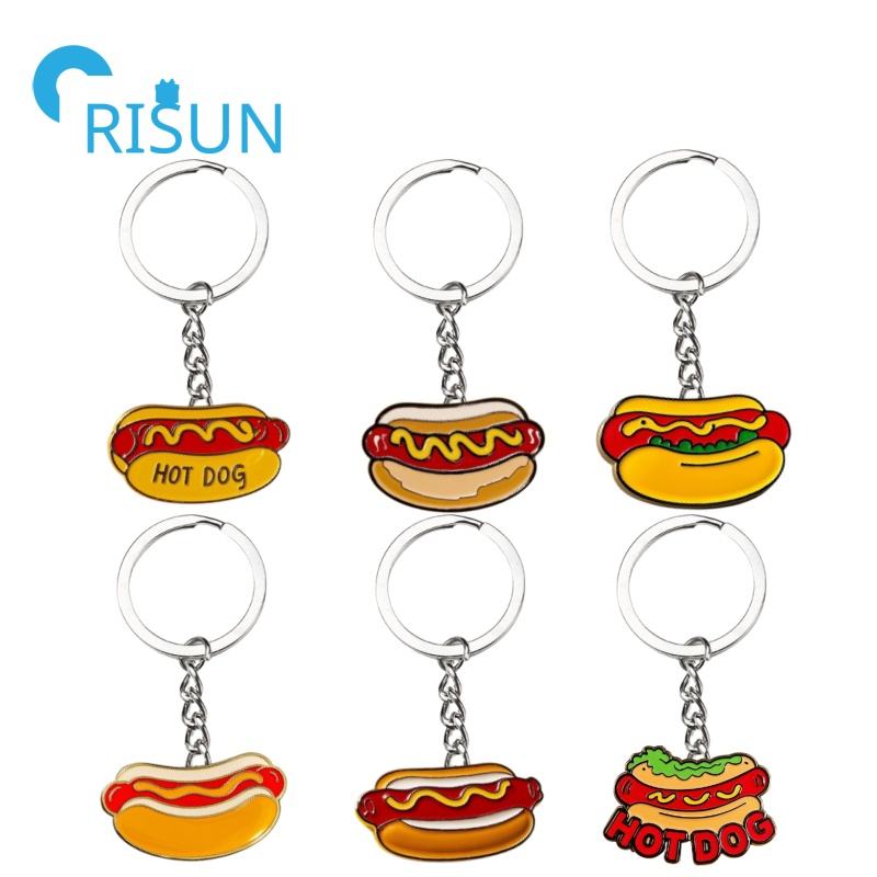 Fabricación de Metal Snack Foods Llavero Esmalte personalizado Hot Dog Llavero Salchicha roja Hotdog Food Llavero