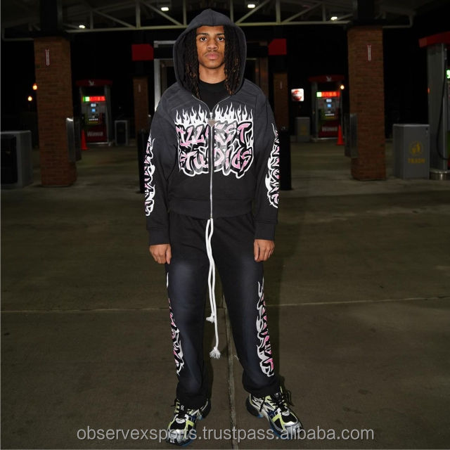 Fabricado a medida parche bordado Rhinestone Zip up Jogger Set chándal hombres 100% algodón Streetwear pantalones de chándal y Sudadera con capucha conjunto