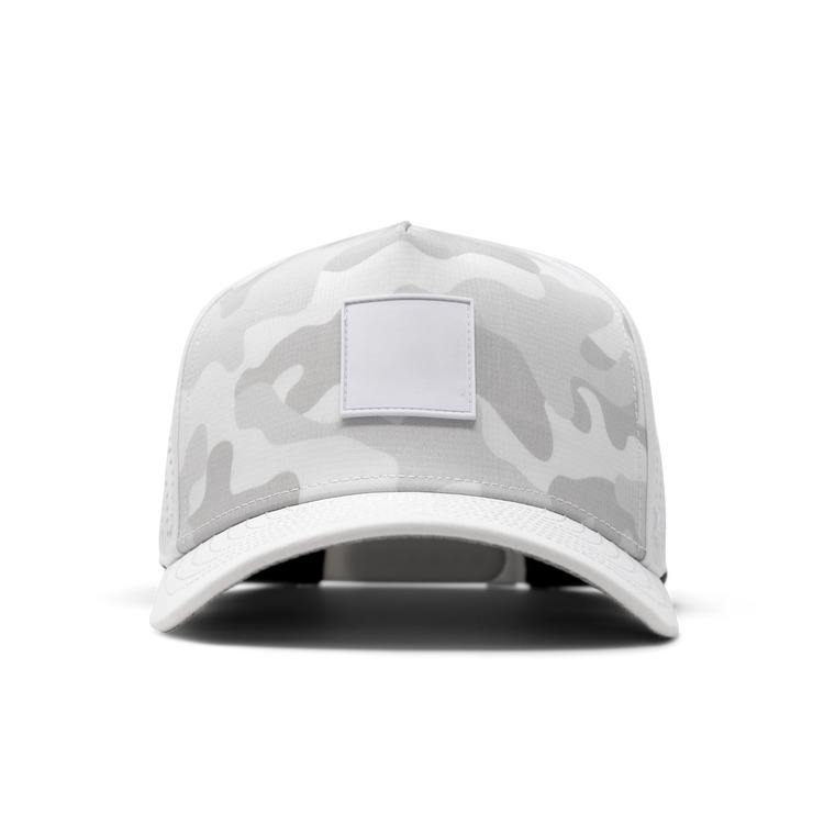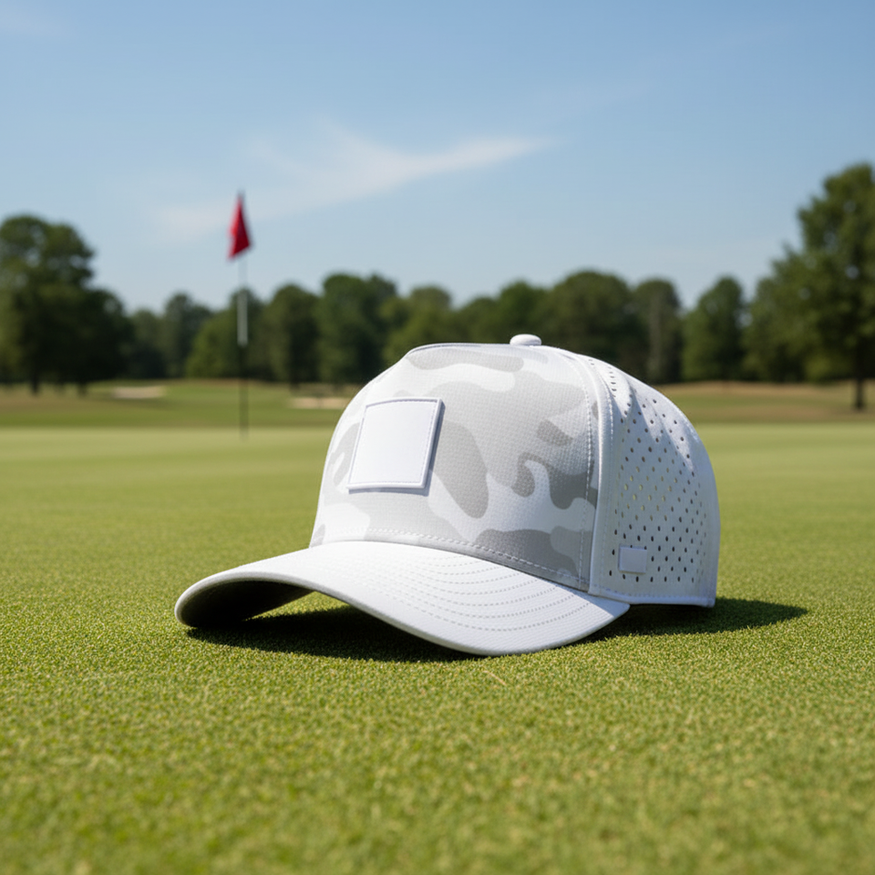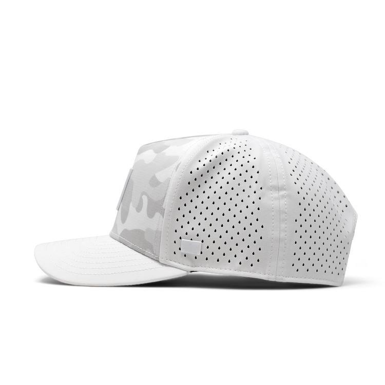 Gorra de béisbol impermeable de 5 paneles del fabricante, gorra de golf personalizada con logotipo de silicona para hombre con orificio cortado a láser y camuflaje.