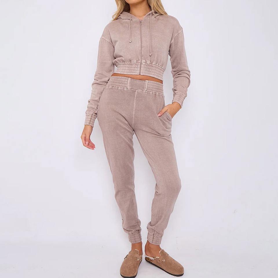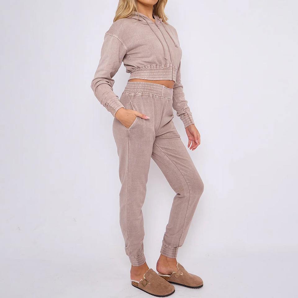 Sudadera con apliques de fabricante, conjunto de chándal con capucha y pantalones de chándal recortados con lavado ácido para mujer