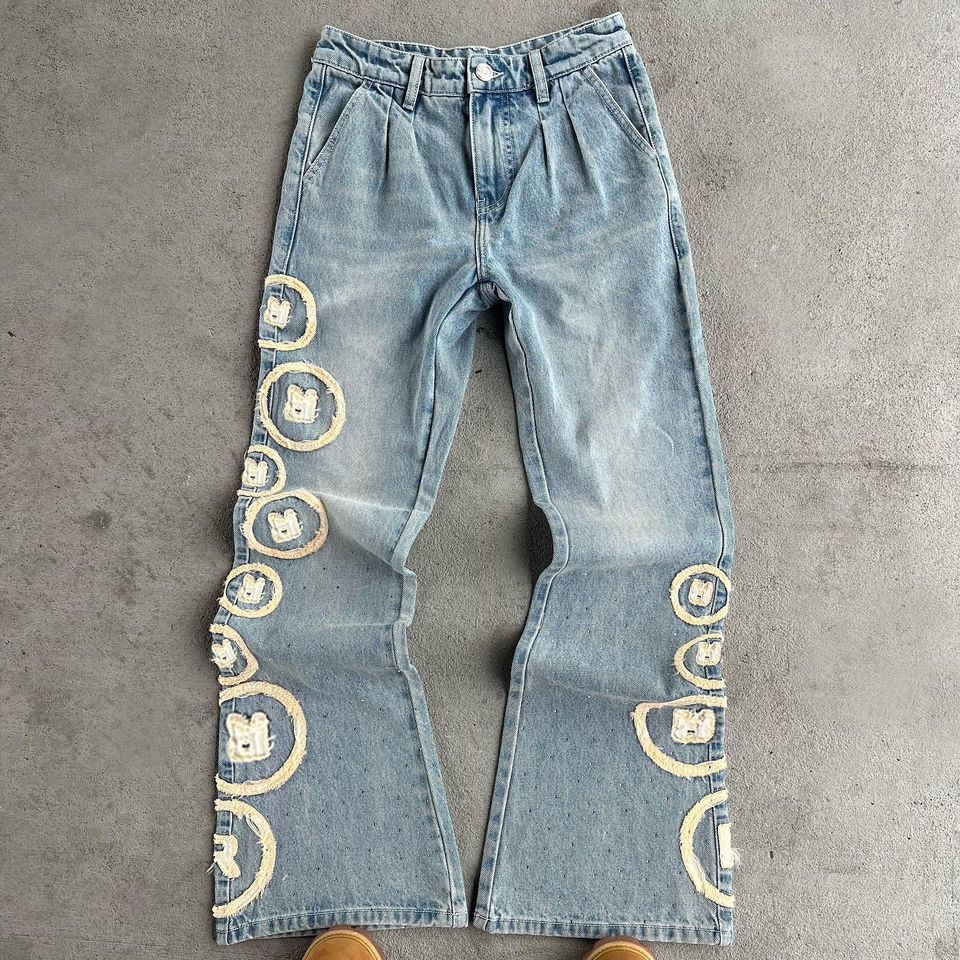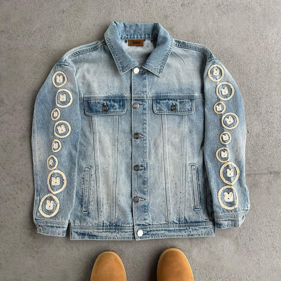 Conjunto de Chaqueta y Pantalones Vaqueros Bordados Unisex Estilo Urbano con Lavado Ácido y Pedrería, Diseño Vintage Personalizado por el Fabricante, para Invierno
