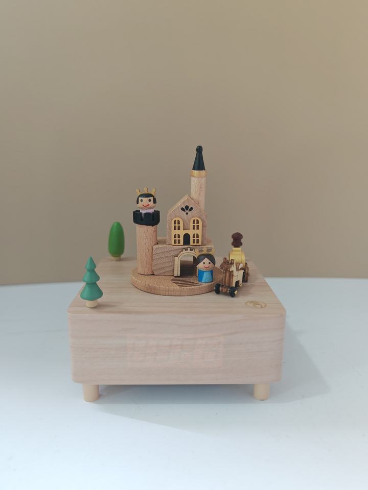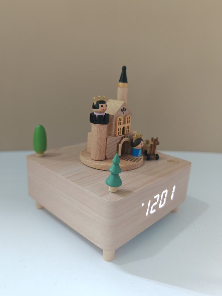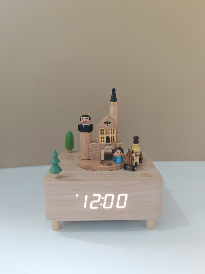 Fabricante personalizado King's Castle giratorio Royal Carriage caja de música reloj despertador caja de ocho tonos juguete de madera para niños
