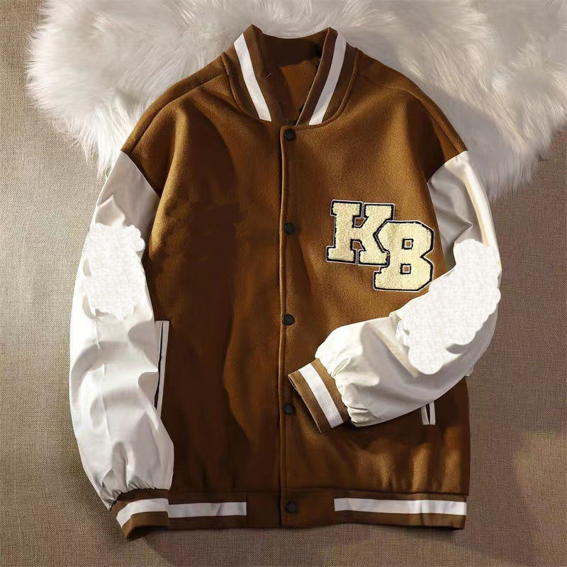 Chaqueta universitaria de alta calidad con bordado de parche personalizado del fabricante, chaqueta combinada de color con cuello levantado y cremallera para hombre