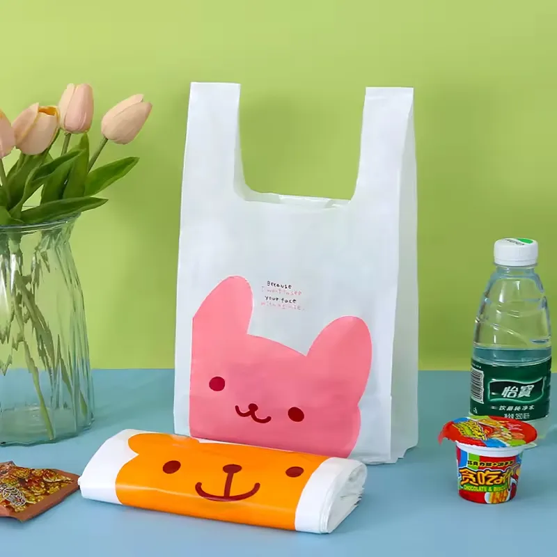 Bolsa de embalaje de camiseta de plástico reciclado de supermercado con logotipo personalizado del fabricante, gracias, camisetas, bolsas de compras de plástico