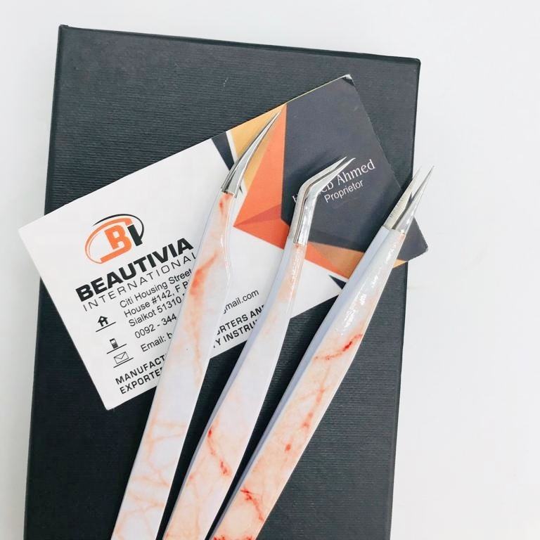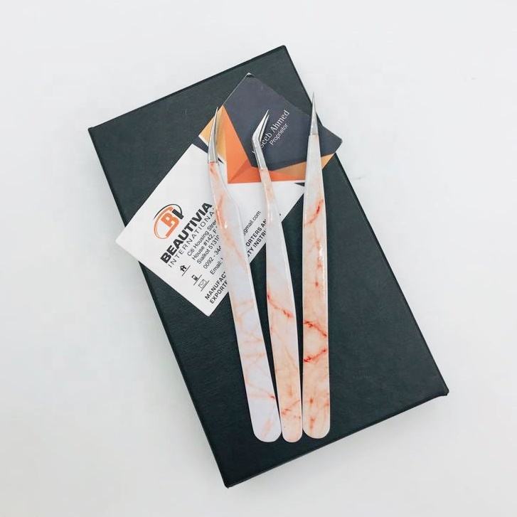 Pinzas de pestañas de acero inoxidable con estampado de mármol personalizables profesionales, herramienta de extensión de pestañas de agarre fuerte con punta puntiaguda