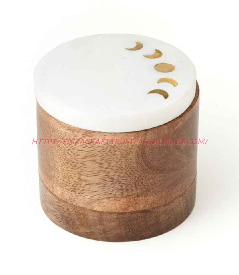 Caja de madera de mango de mármol hecha a mano y tapa de latón para perillas Caja Juegos de regalo Caja de madera de forma redonda para tamaño personalizado