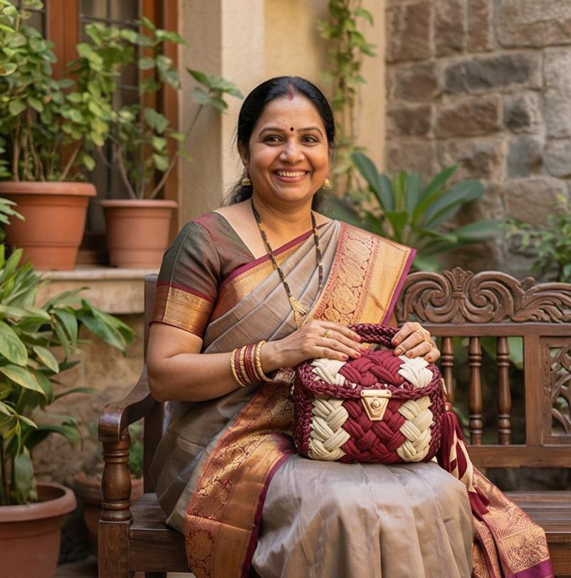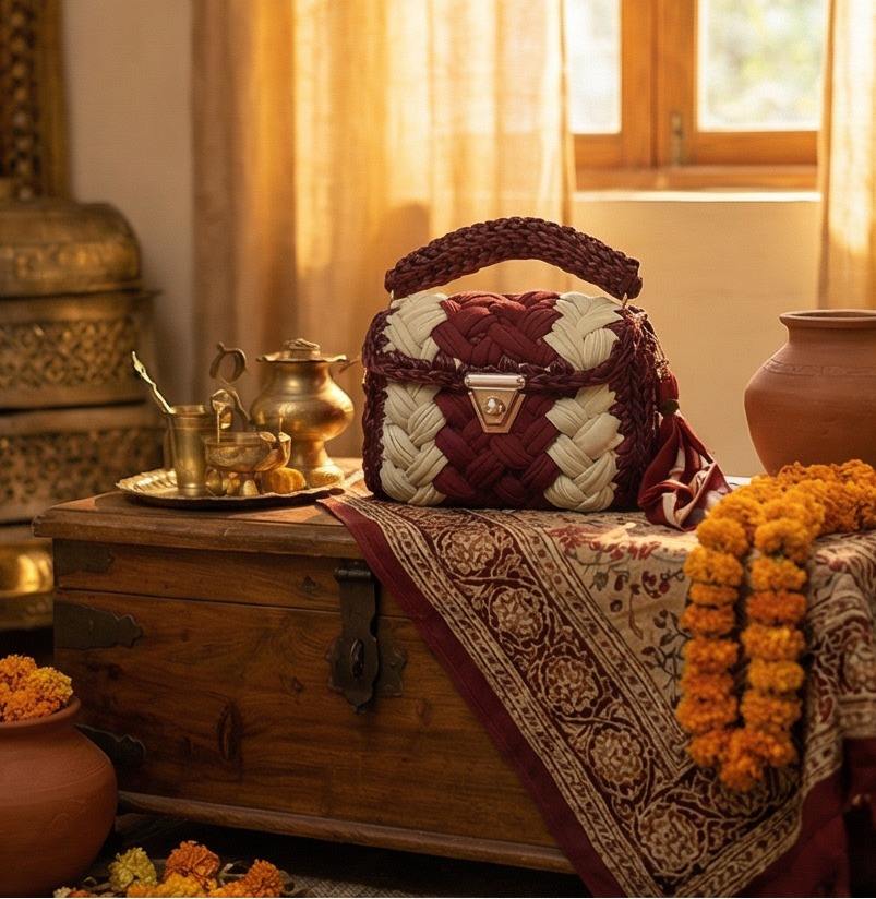 Bolso Metálico con Borde Marrón, Bolso Hecho a Mano con Perlas, Bolso de Dos Asas, Bolso de Hombro Estilo Boho, Tejido de Cordón de Algodón para Mujer