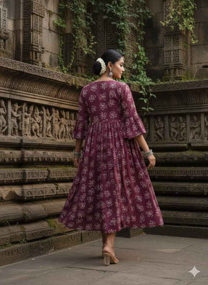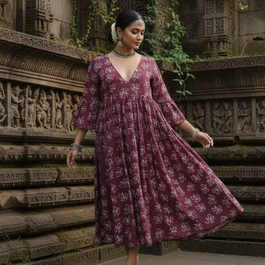 Vestido Midi Estampado a Mano Color Granate, Cuello en V, Manga Acampanada, Vestido de Verano de Algodón para Mujer, Vestido Étnico Bohemio, Ropa Artesanal India