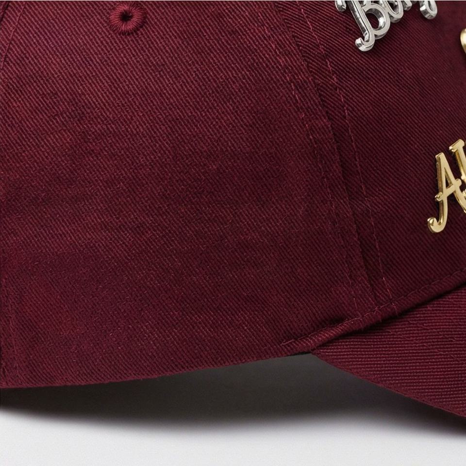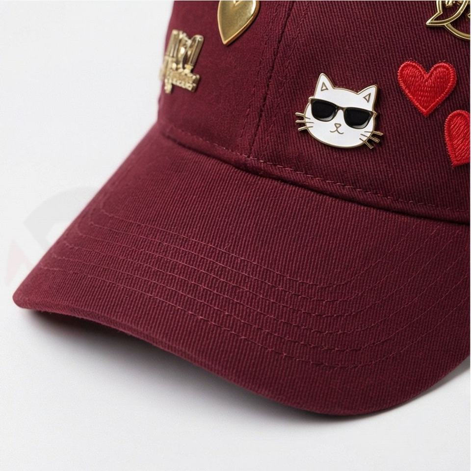 Gorra de béisbol rojo granate con adornos de metal surtidos y corazón felino, estilo de moda de verano para hombre, cómoda y a la moda.