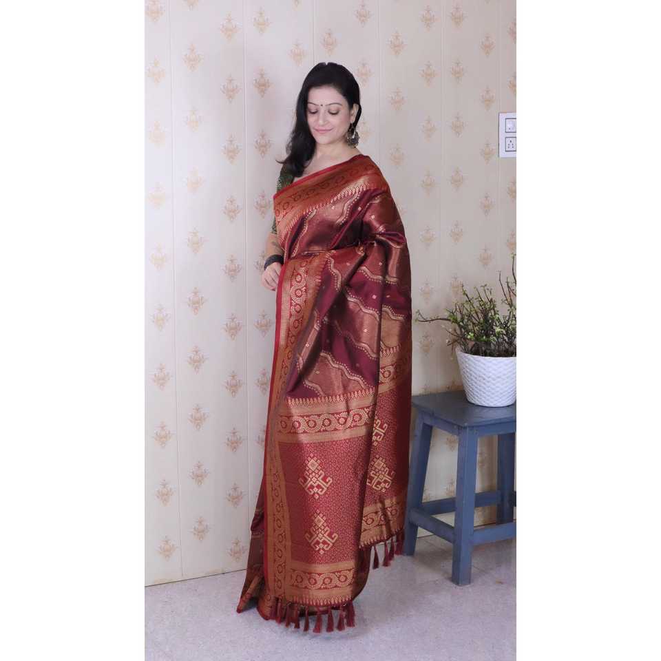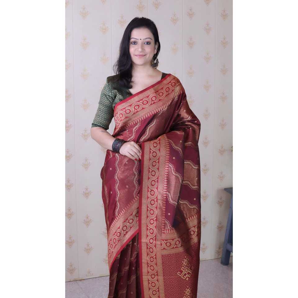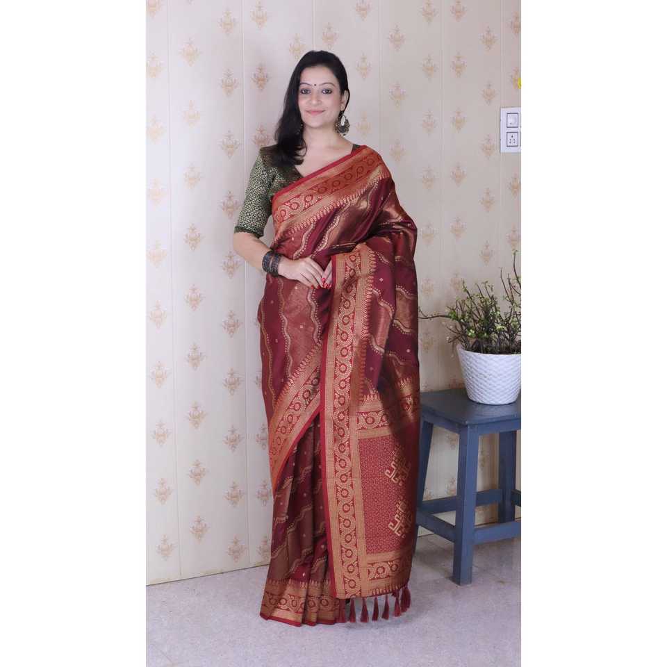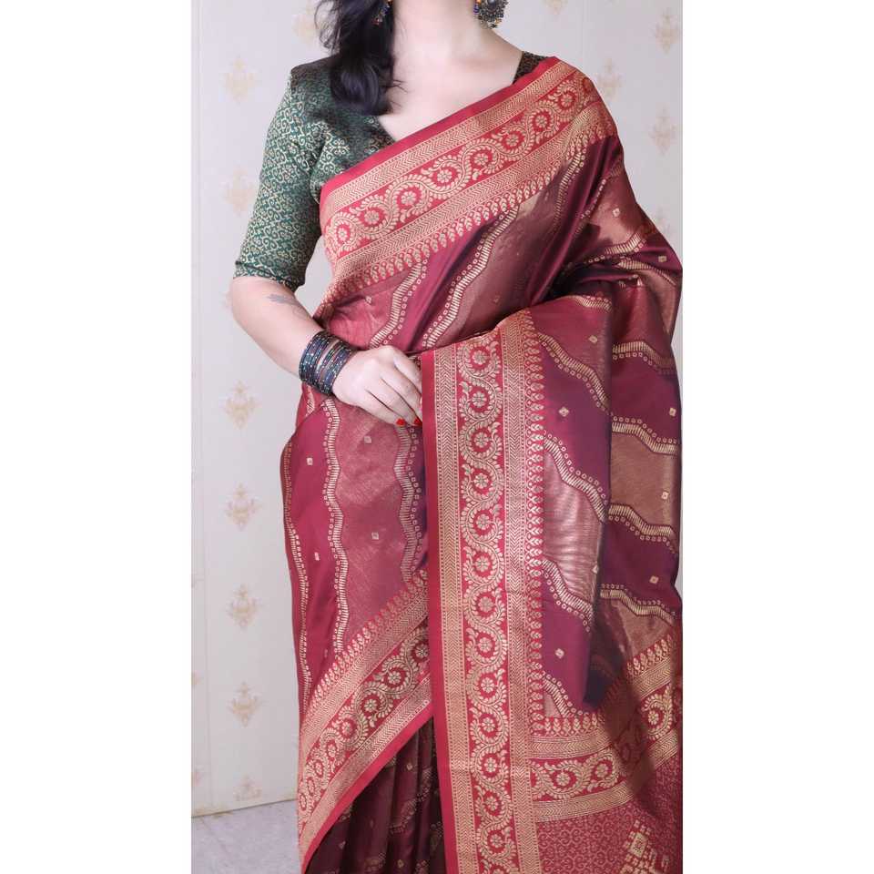 Sari de Seda Suave Color Granate, Bandhani Leheriya, Tejido con Hilo Zari, Vestidos Elegantes para Club