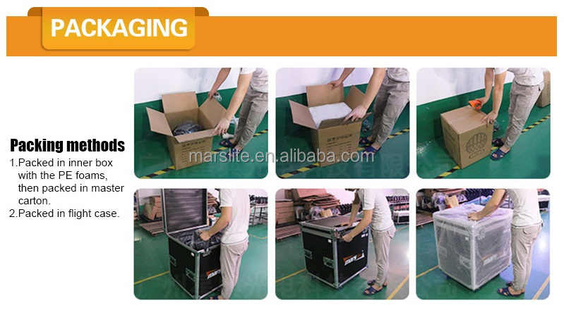 El equipo de iluminación de escenario se empaqueta primero en la caja interior, luego se embala en la caja de cartón con las espumas, gratis para cartón y carga para estuche de vuelo.