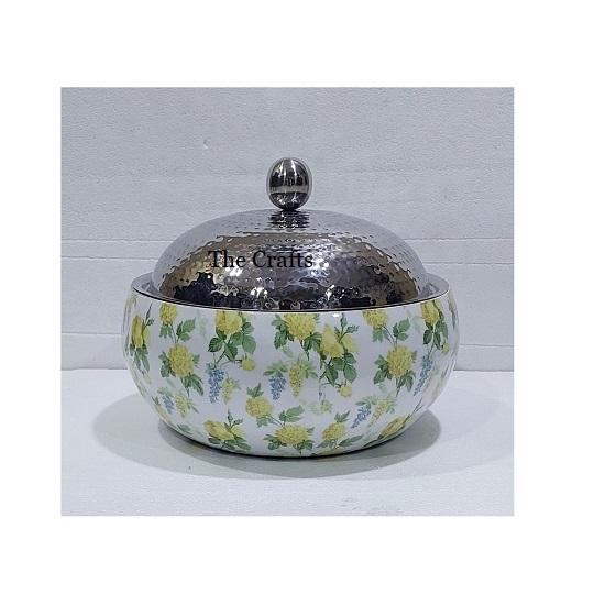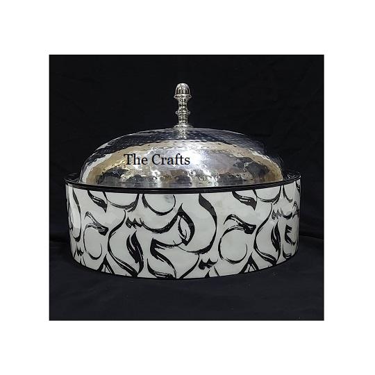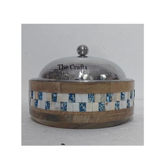 Maravilloso diseño para servir comida, olla caliente en madera y vajilla de nácar, cazuela con tapa de vidrio