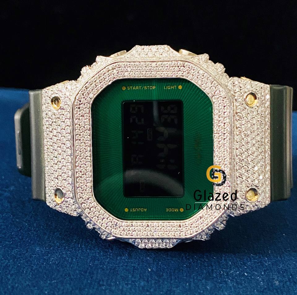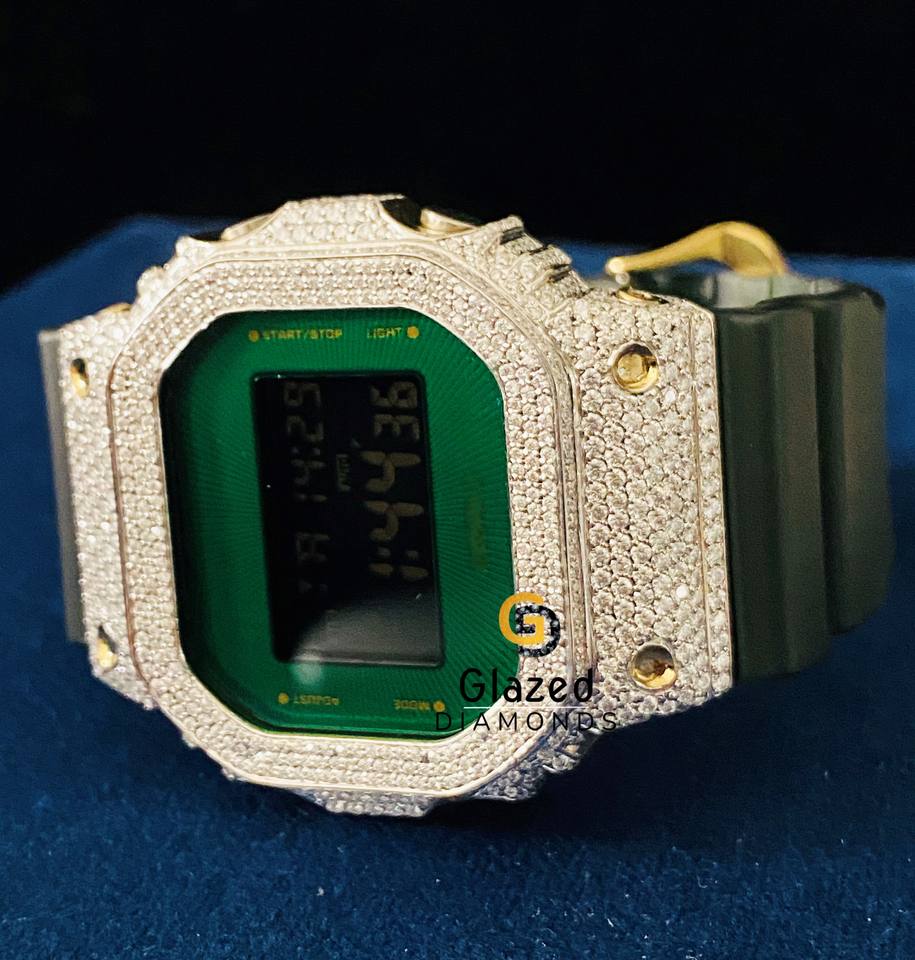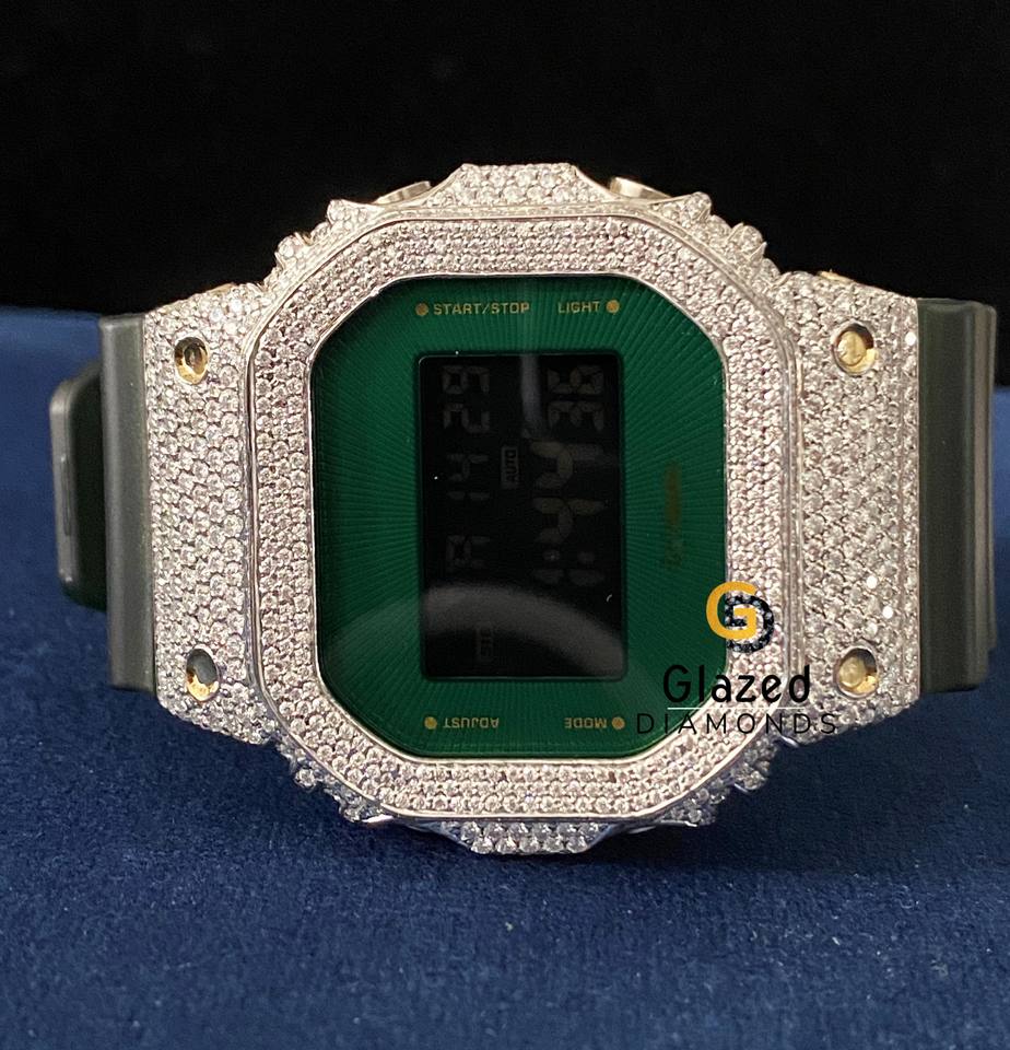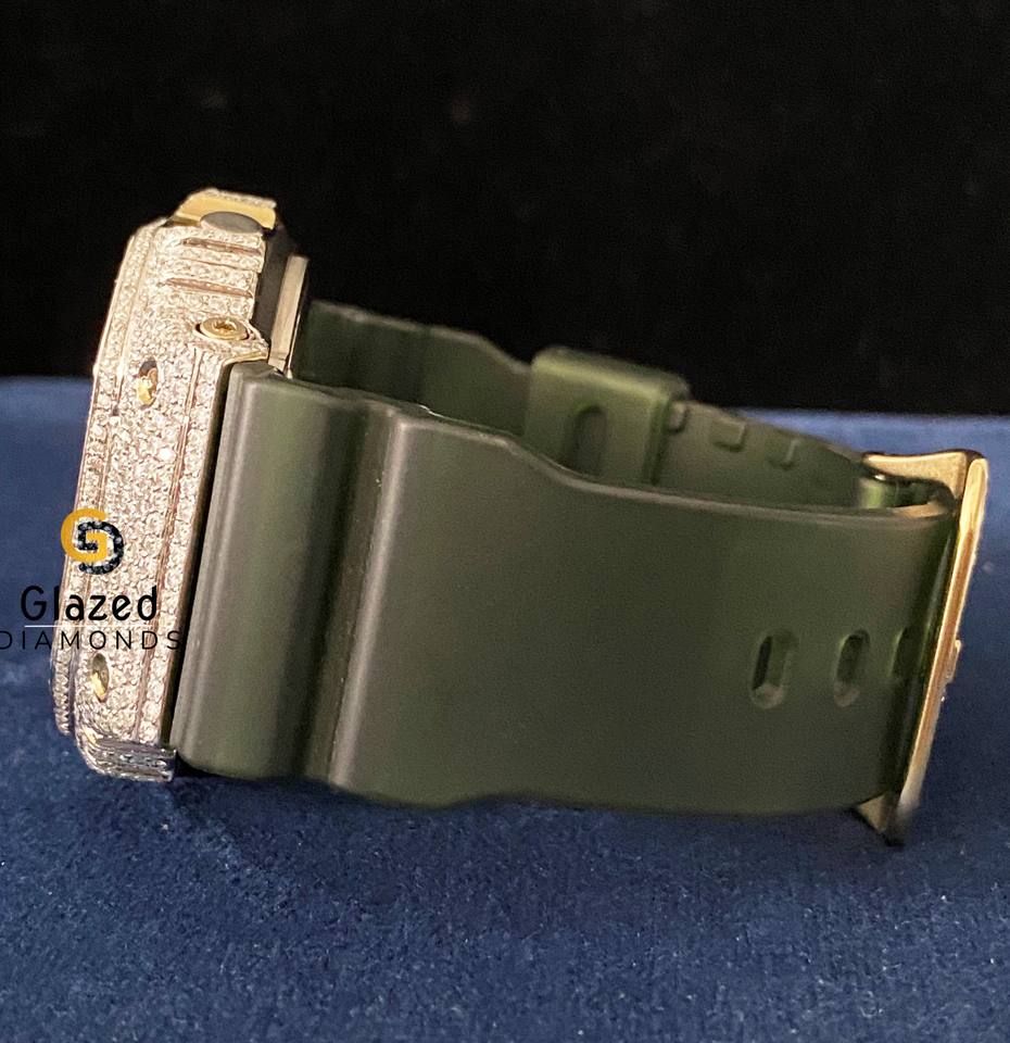 Maravilloso reloj Moissanite con pantalla digital con corte redondo VVs diamantes de claridad y cinturón de goma verde para hombres