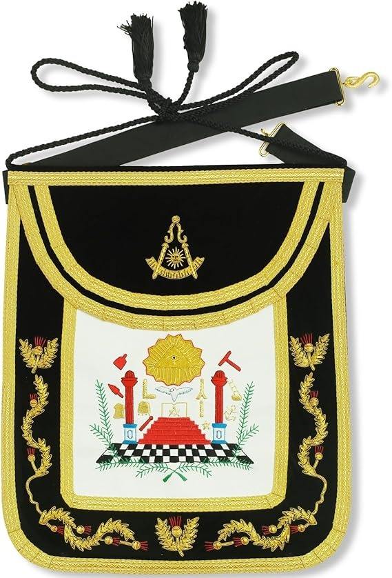 Delantal Masónico Premium de Piel de Cordero Pastmaster, Negro, Bordado a Mano con Terciopelo, con Cinturón Ajustable y Cuerda - Bordado a Mano Oficial