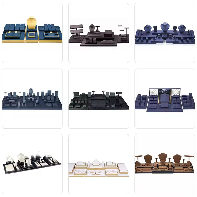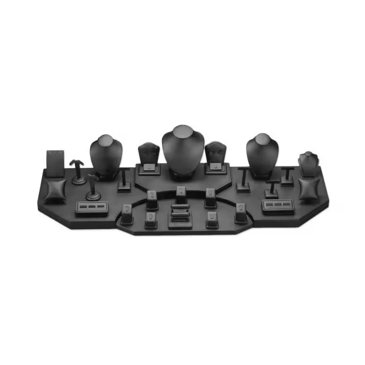 Expositor de joyería de madera y resina negra para escaparate, juego de exhibición de joyas con soporte para collar en color gris piedra a juego.