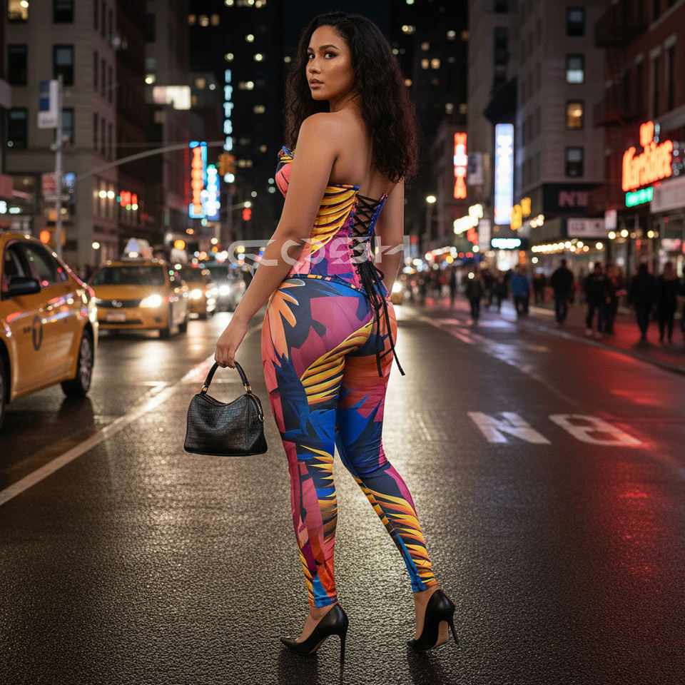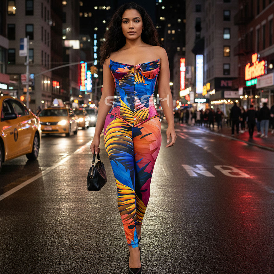 Conjunto de corsé y leggings a juego, hecho en satén, corsé y leggings de malla transparente transpirable, ropa moldeadora tropical sublimada de moda.